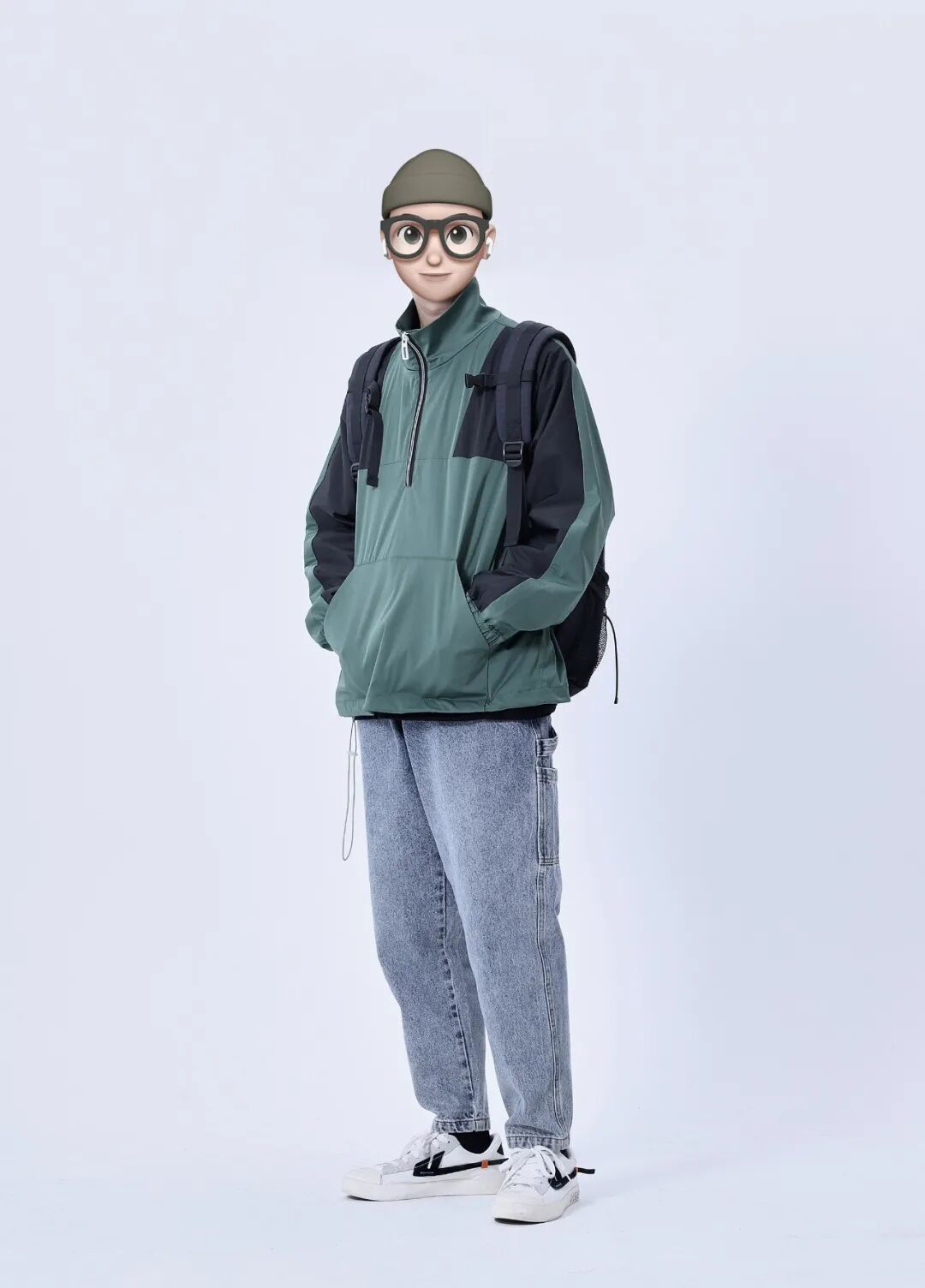 一套以撞色主题贯穿的穿搭,这件套头夹克虽不像机能风那般硬朗,但是搭配束脚版型的裤子同样可以提起整个人的精气神,还有不错的视觉增高效果。