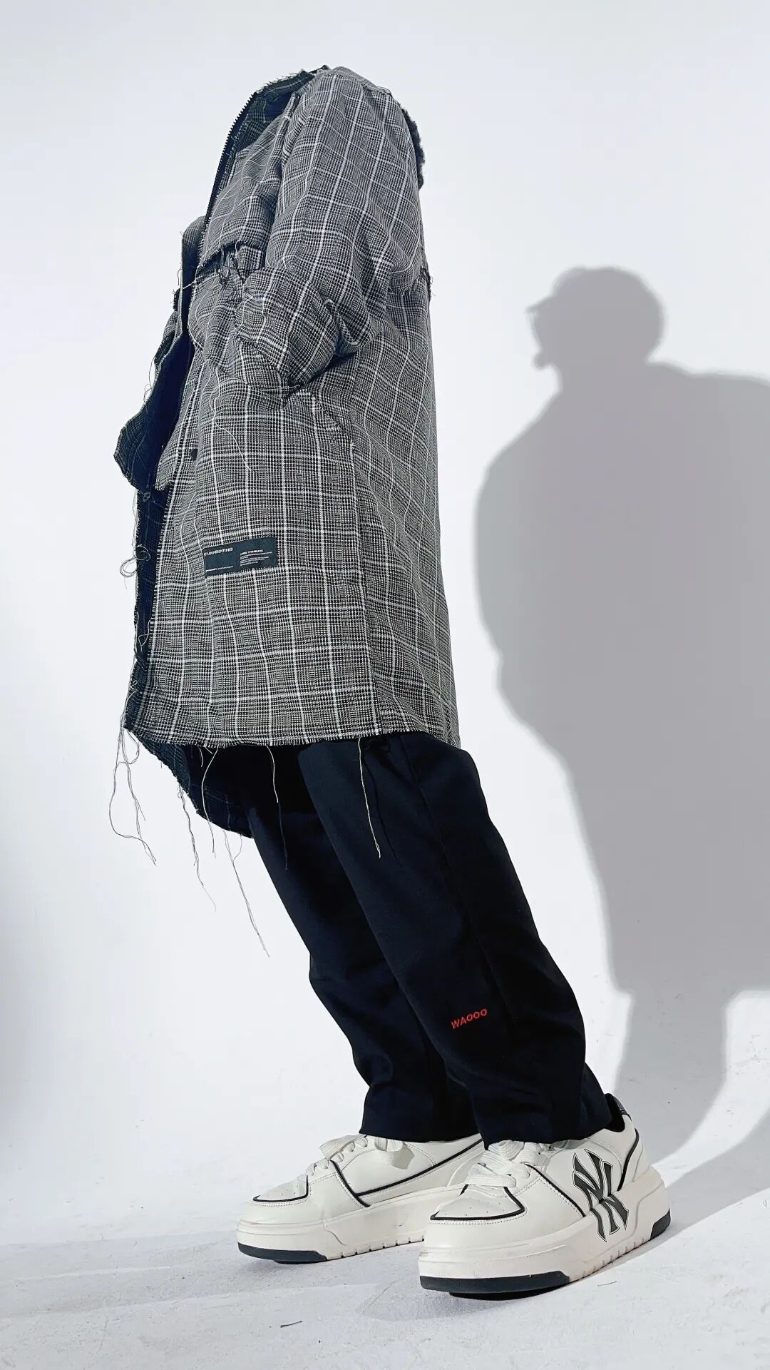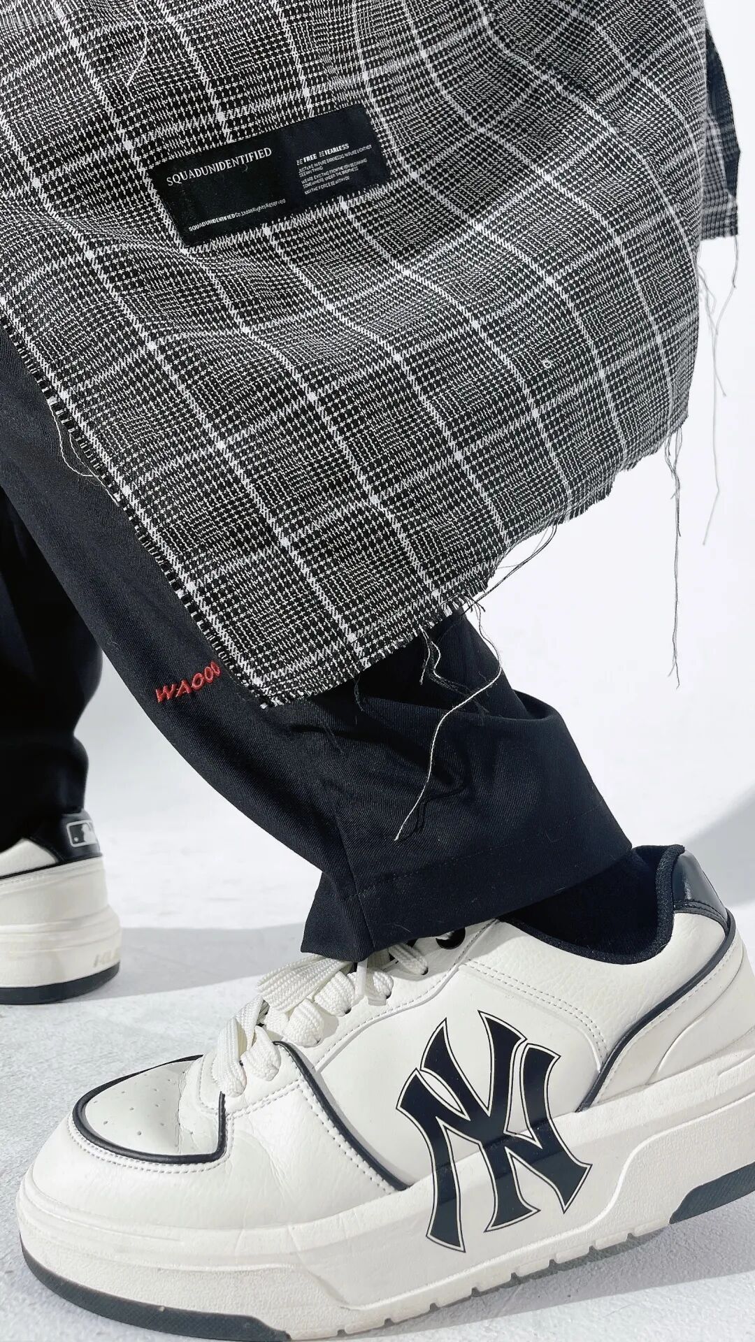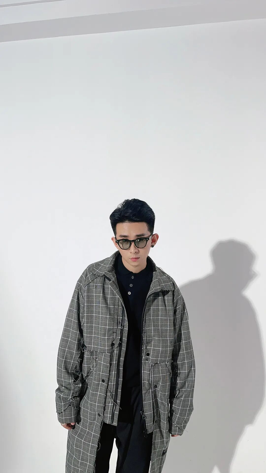 因为外套是中长款的千鸟格大衣,衣服在款式的设计上细节也比较多,所以内搭和裤子都选择了相对安全的纯黑色,既不会喧宾夺主,也不会轻易出错。鞋子方面,稳当一点的话就黑色,想要活力一点,可以试试白色。