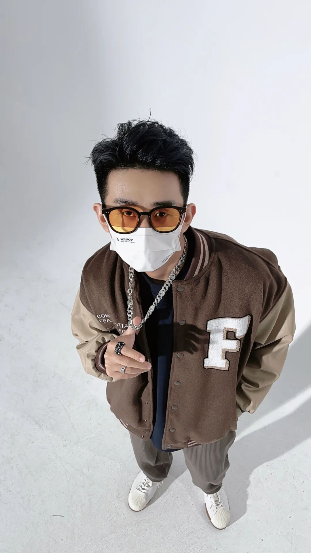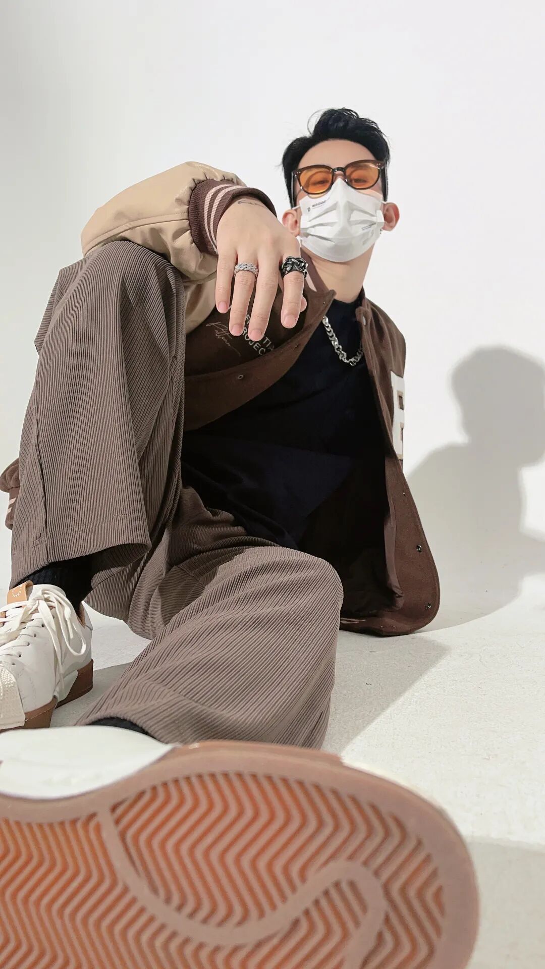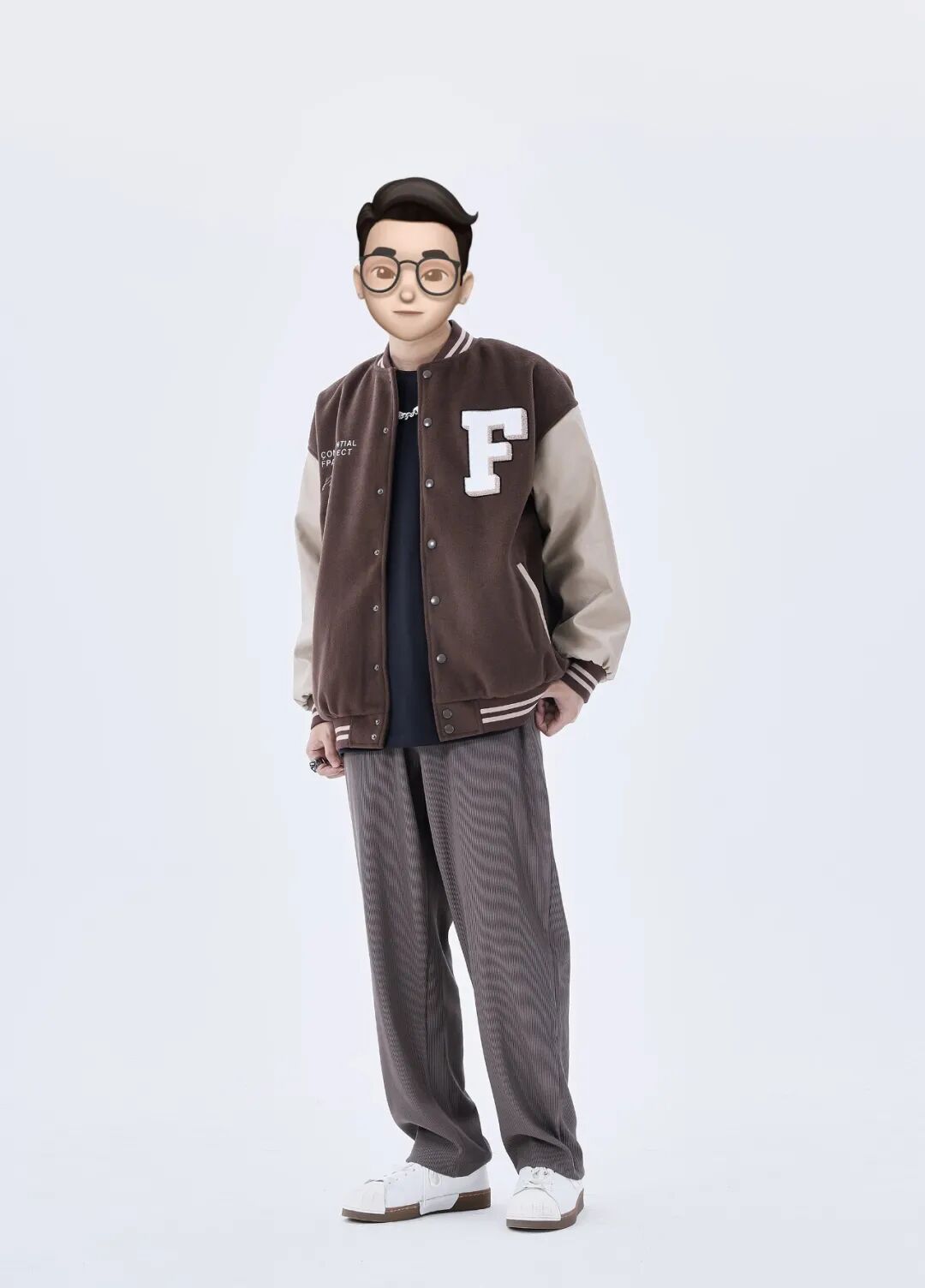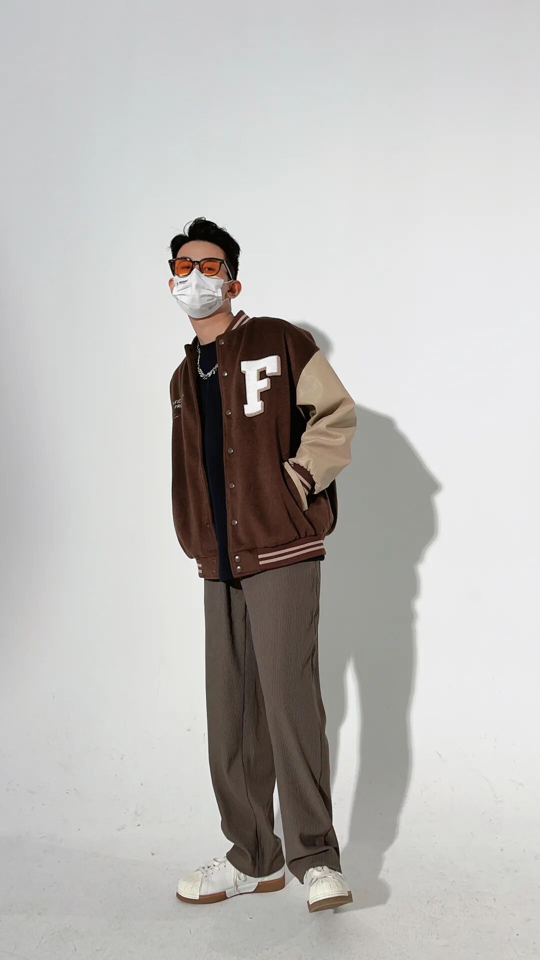 这是一套棕色色调的邻近色搭配,因为色彩都是比较接近的,所以选择了深色的内搭和小白鞋来作为点缀,来提升整体的分量感和活力感。