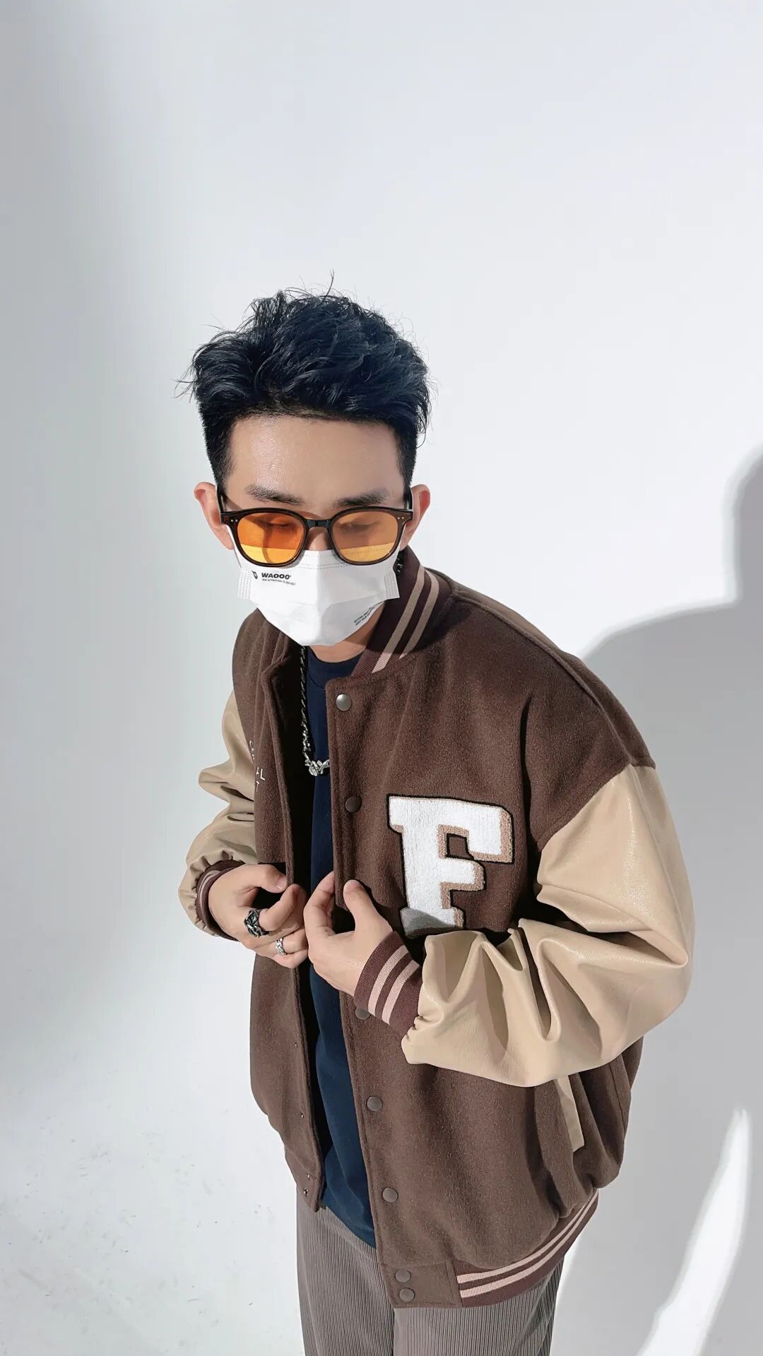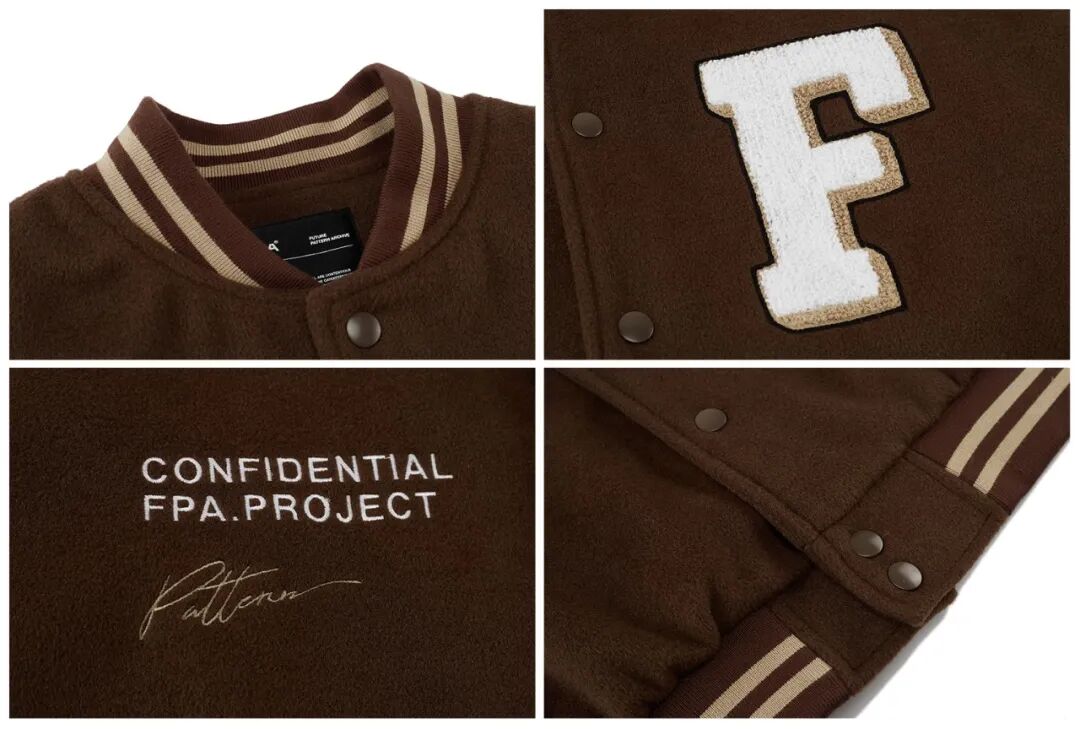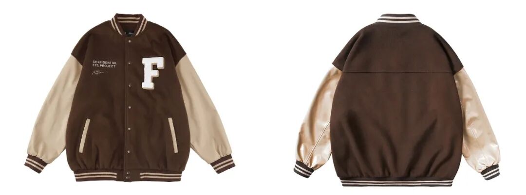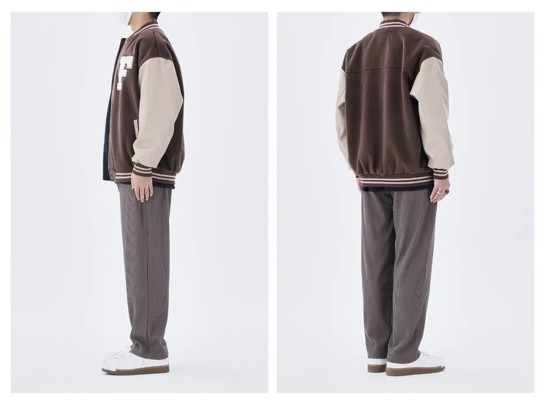 棒球服采用了优质的PU皮拼接毛呢面料,且不说质感优秀,成衣的造型感也超强,属于经典的美式棒球夹克版型。衣服刺绣的整体车线非常精致牢固,领口下摆跟袖口的撞色螺纹搭配也是非常经典的棒球服元素,上身非常出彩!催更棒球服的小伙伴,这件一定要入了!