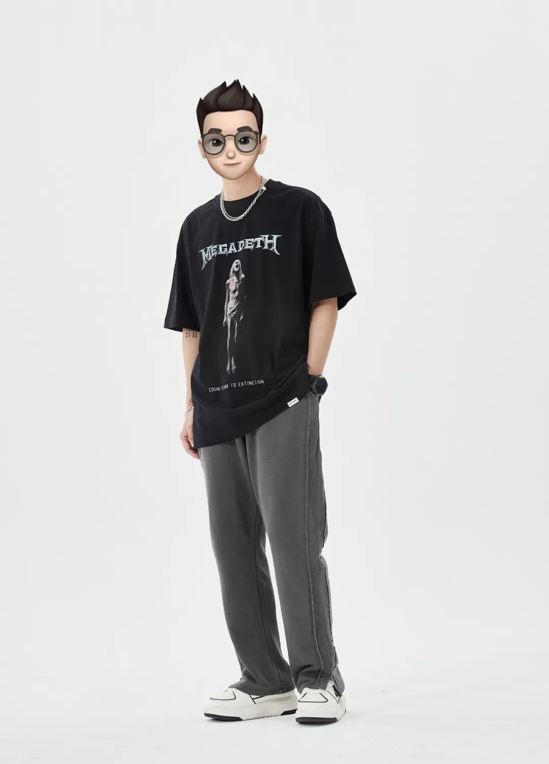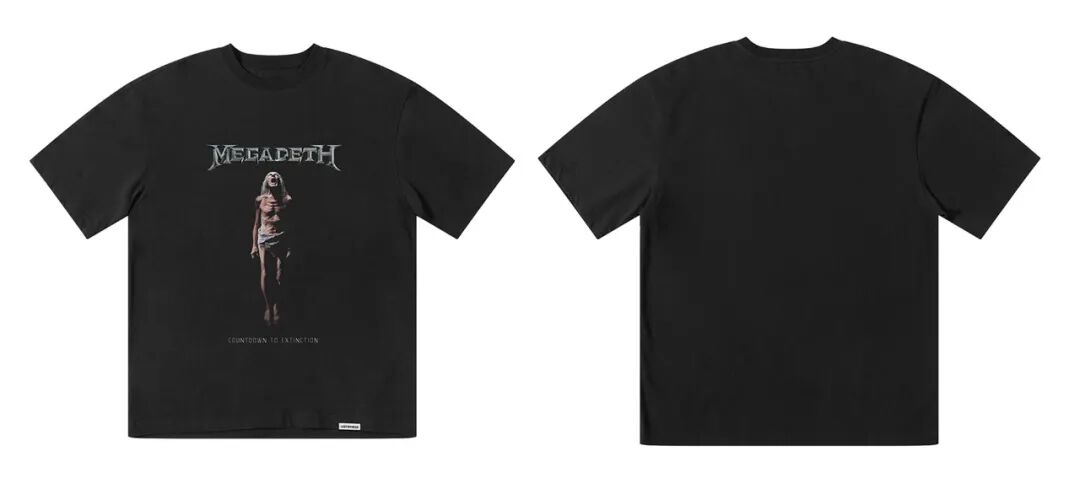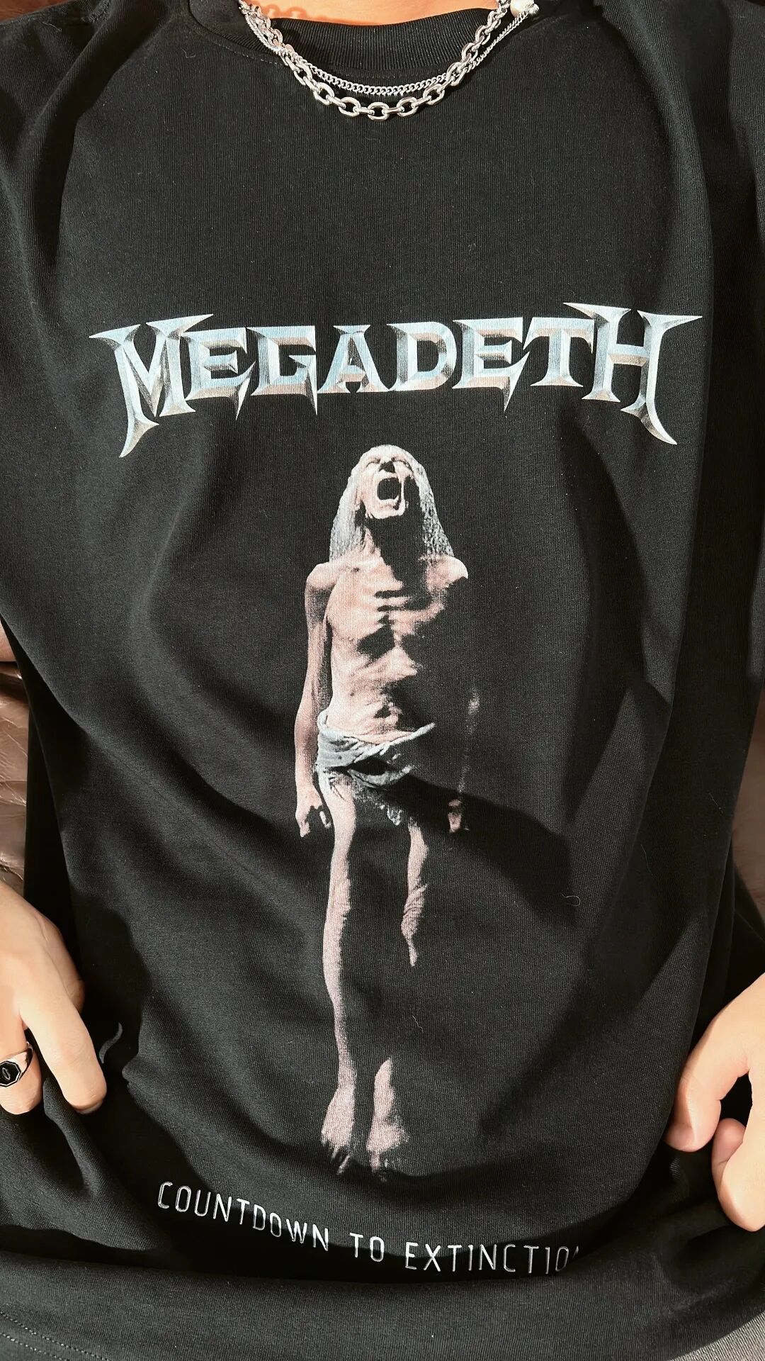 T恤印花是金属乐队MEGADETH的专辑封面,除了金属风格的字体,还带点恐怖美学的味道,细节非常好!成衣采用100%纯棉面料,加宽螺纹处理,领口不易变形,版型宽松,男生女生都能穿,上身简直超酷!