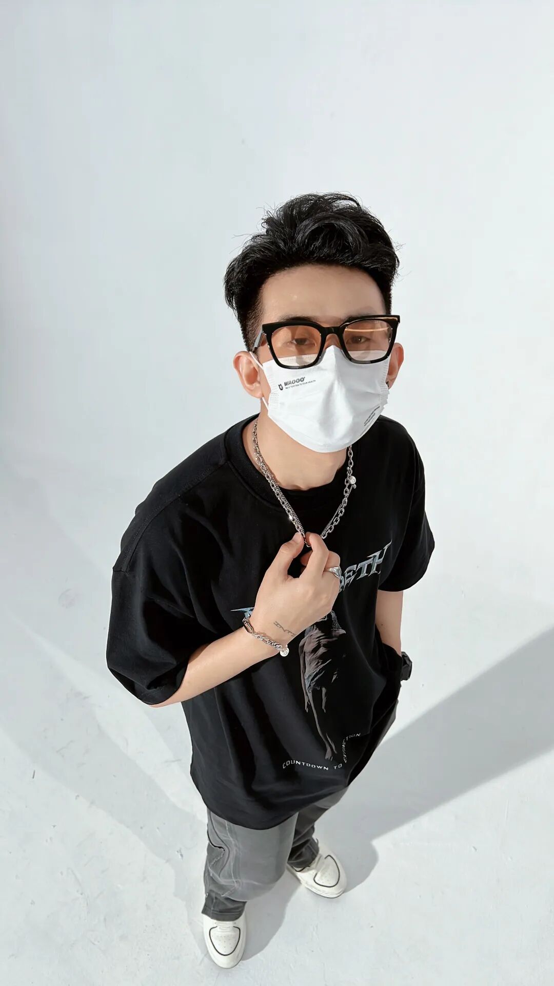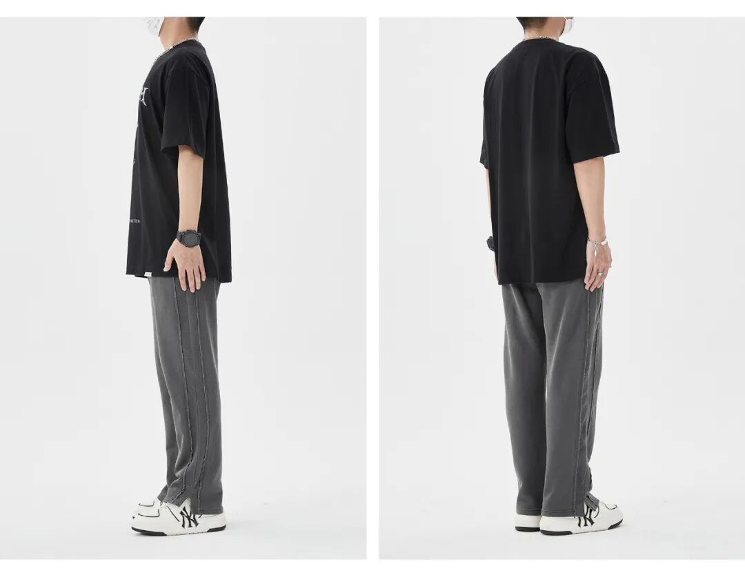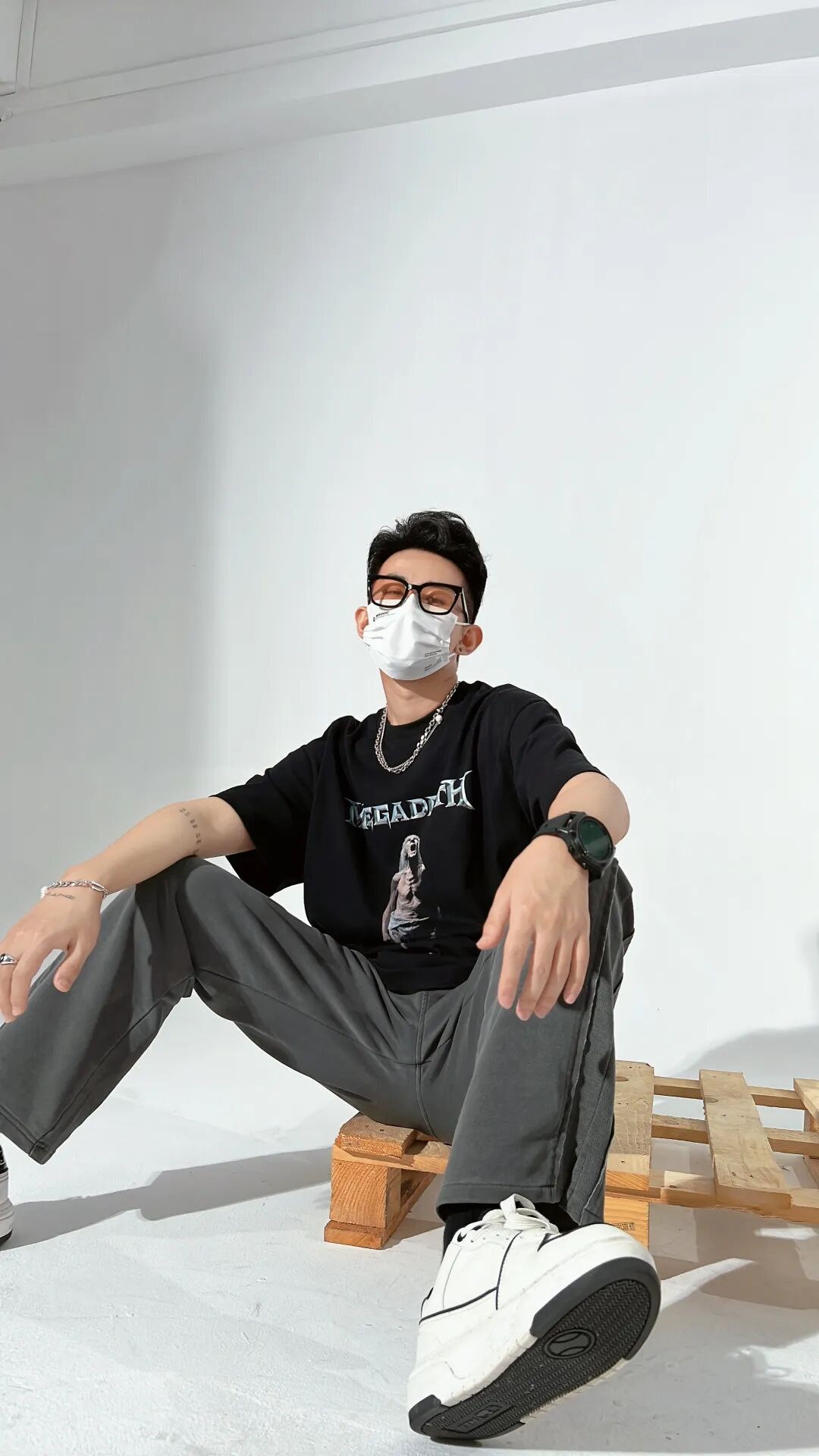 上身一件黑色重金属摇滚复古印花短T,搭配一条深灰色水洗破边盖鞋裤,最后上脚一双MLB的白色厚底板鞋,一套黑白灰搭配完成!