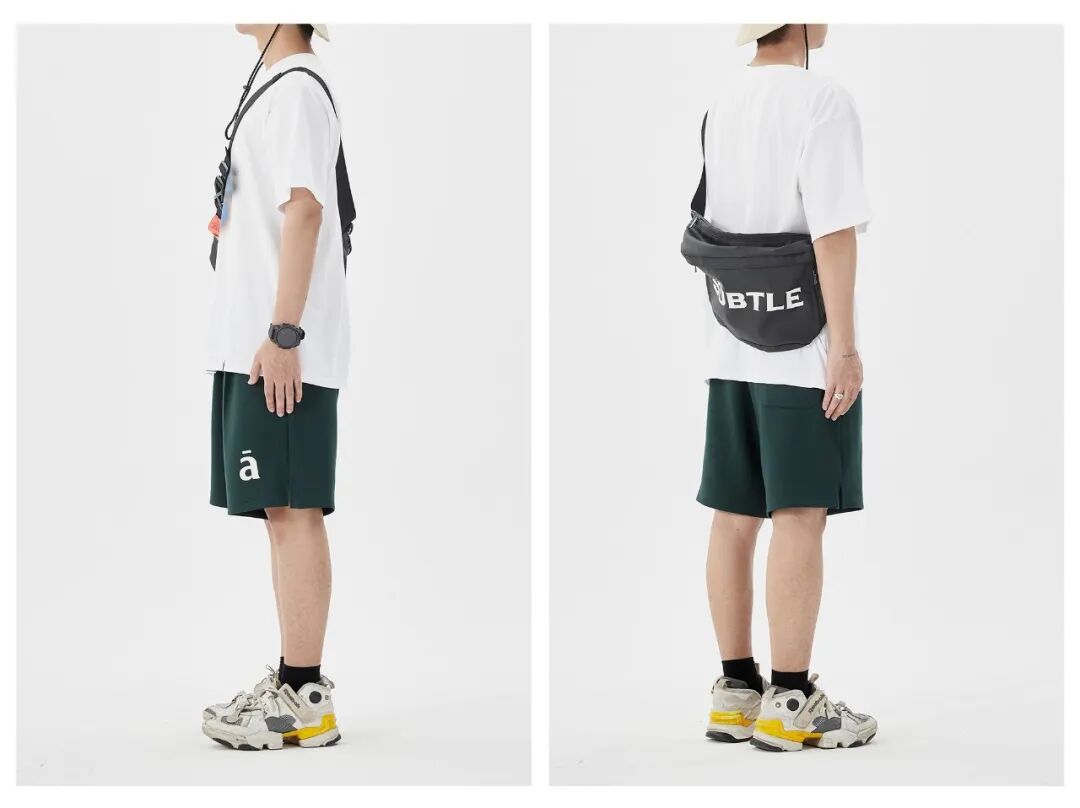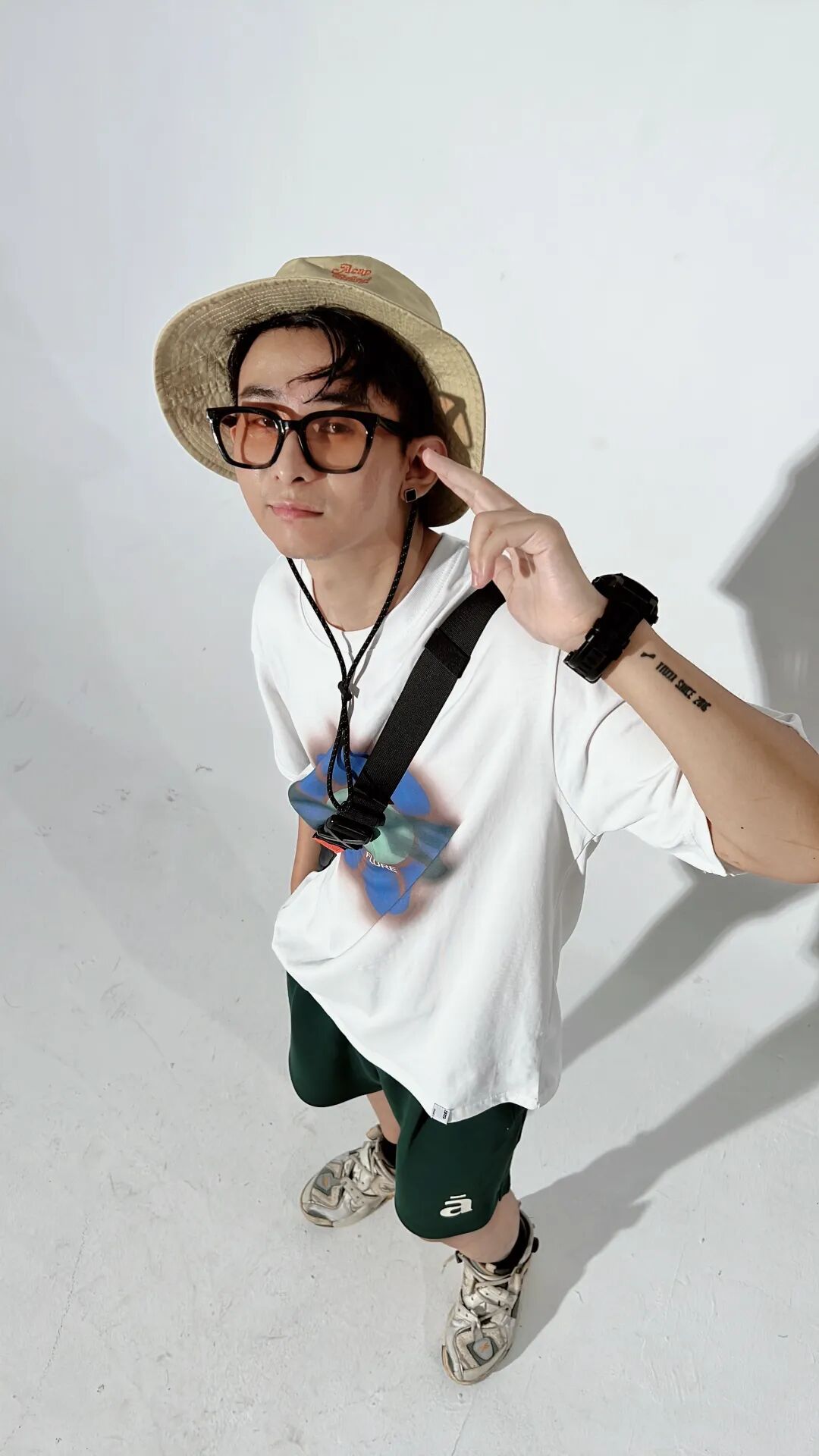 上身一件白底+蓝色小雏菊趣味印花的简约T恤,下身搭配一条质感柔顺丝滑的绿色五分卫裤,脚踩一双米白色复古运动鞋,最后通过手表、斜挎包、渔夫帽等配饰,不断提高搭配完成度。