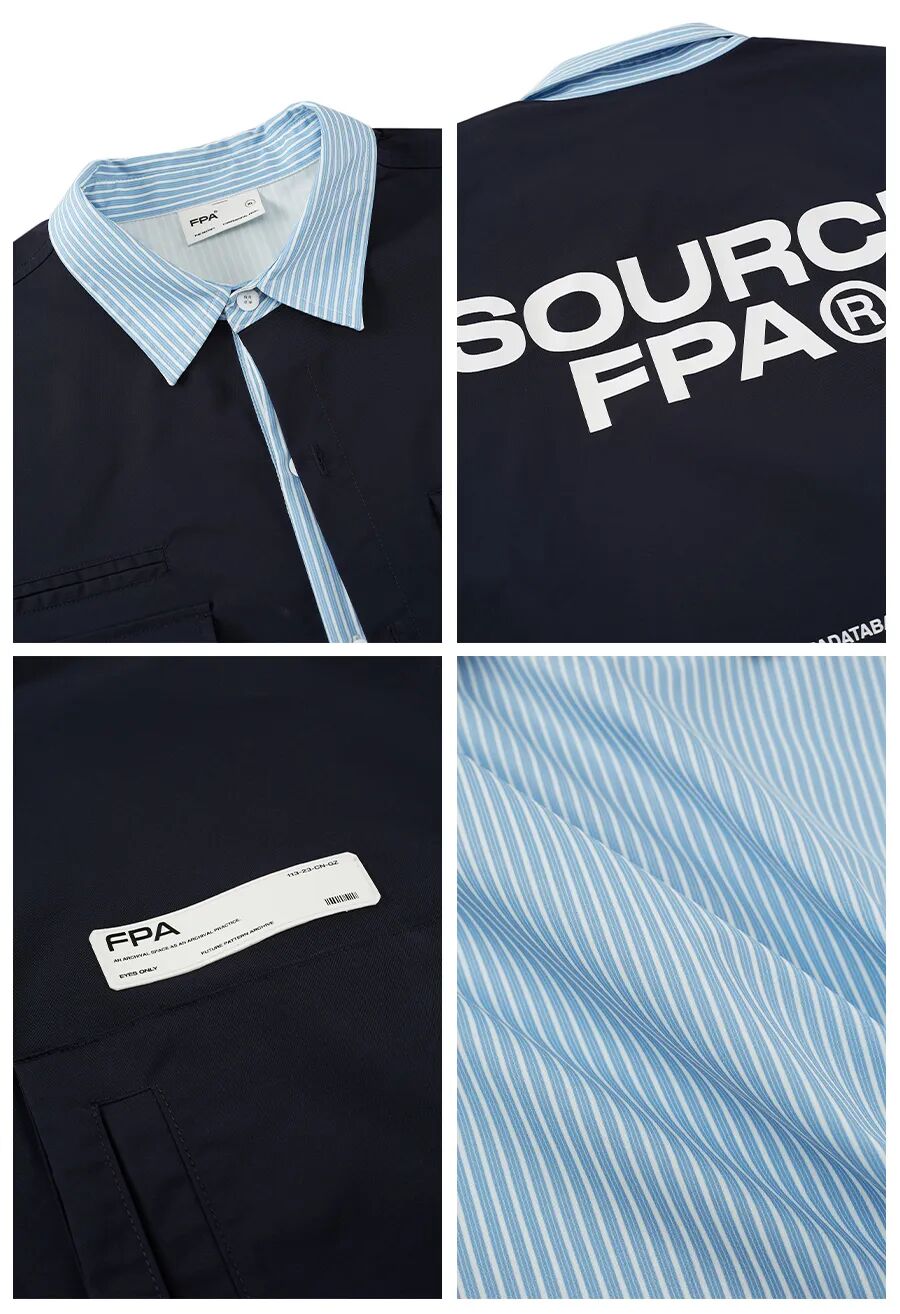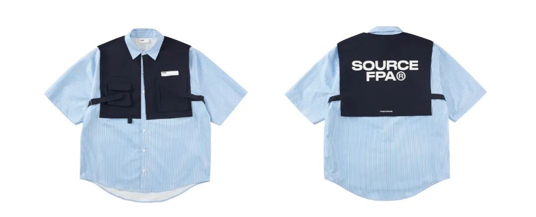衣身采用的是优质聚酯纤维条纹面料,手感硬挺且舒适,成衣拼接了假两件形式的马甲,侧面设置了可调节织带,加上胸前的立体口袋设计,极具机能气息,而且采用了撞色效果来增强视觉,非常具有潮流感!