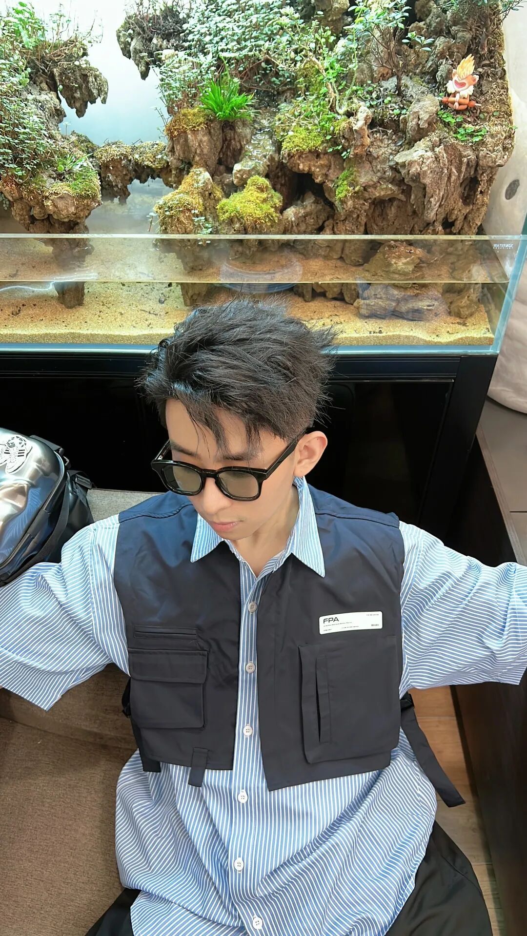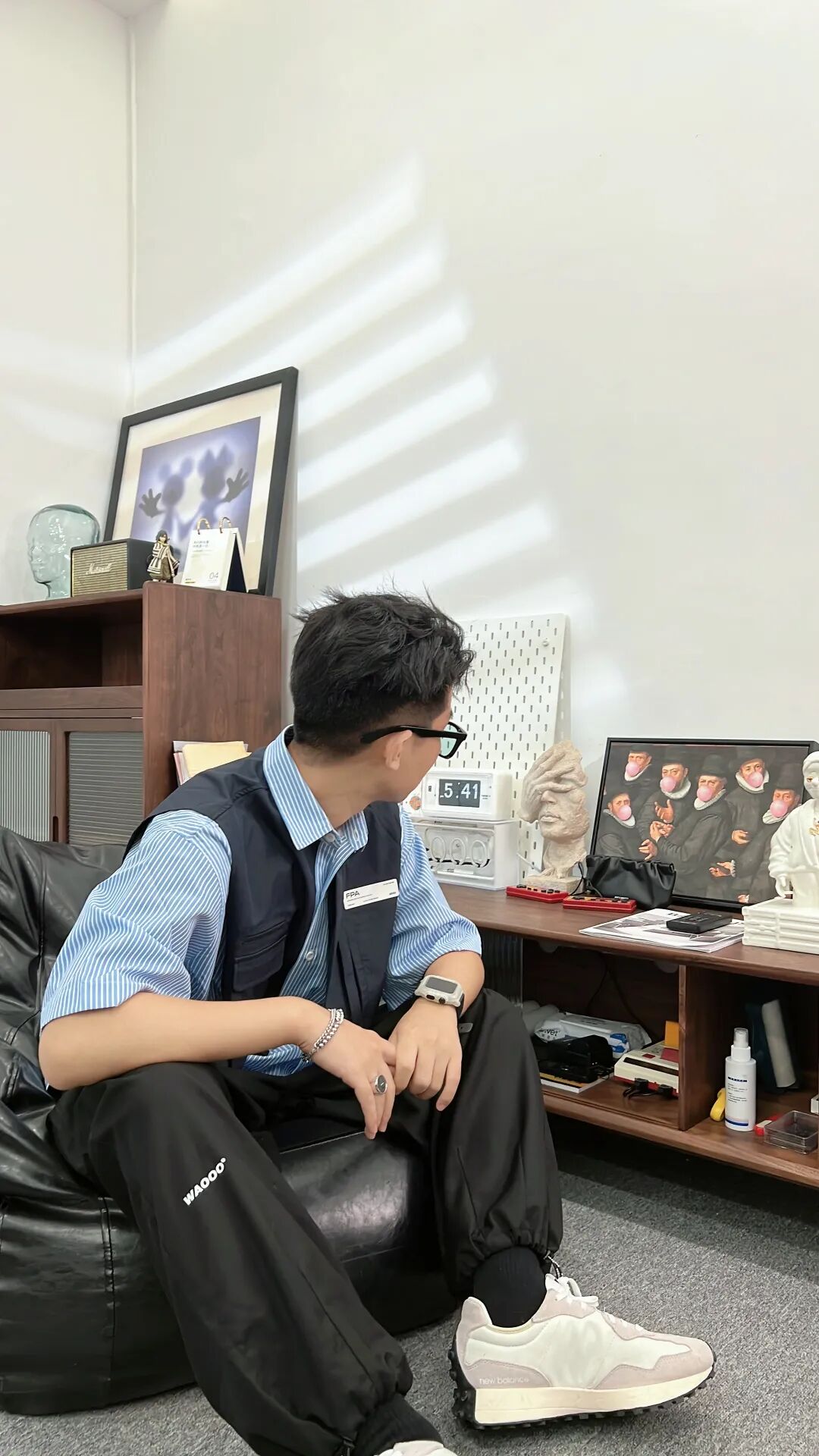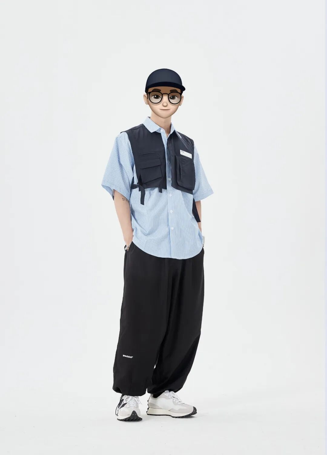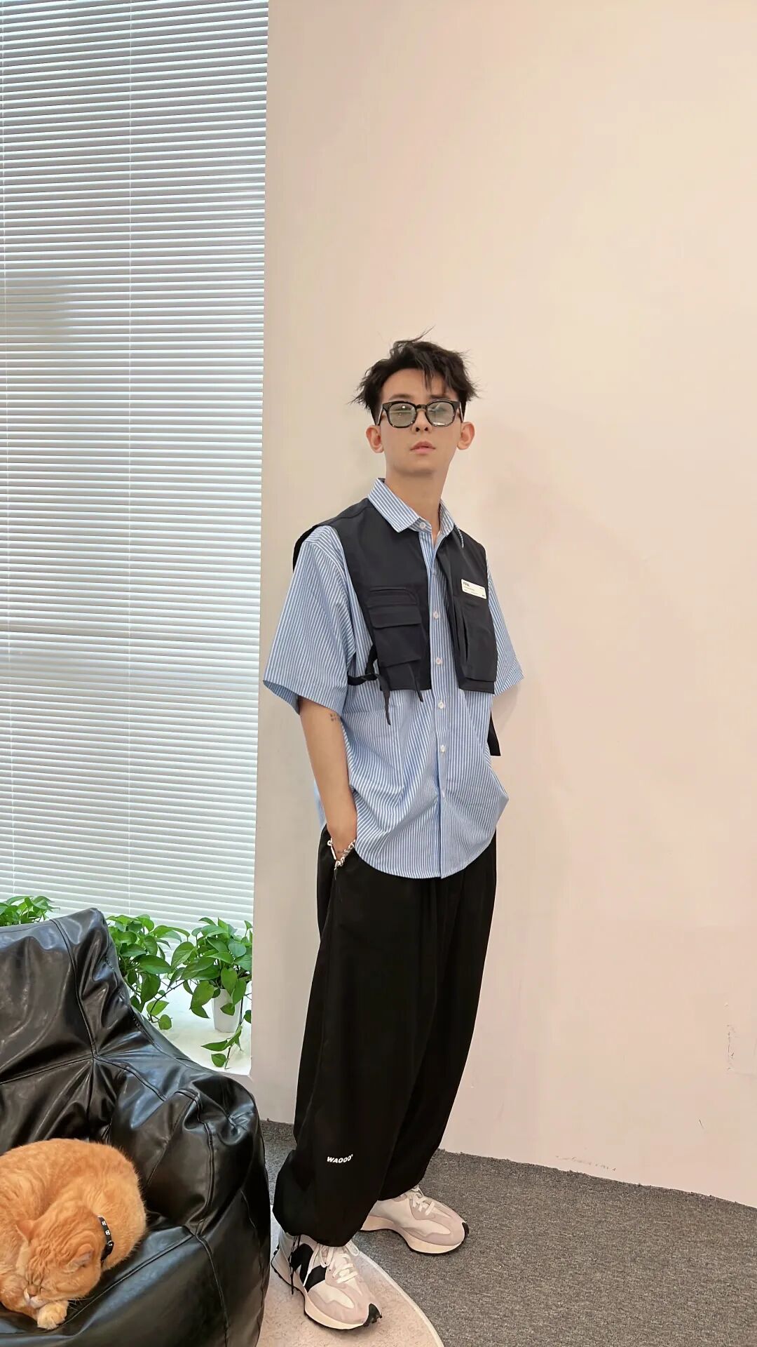 上身一件蓝白条纹的假两件拼接设计衬衫,下身搭配一条黑色日系阔腿武士裤,最后上脚一双灰白撞色New Balance 327,增加一抹亮色。