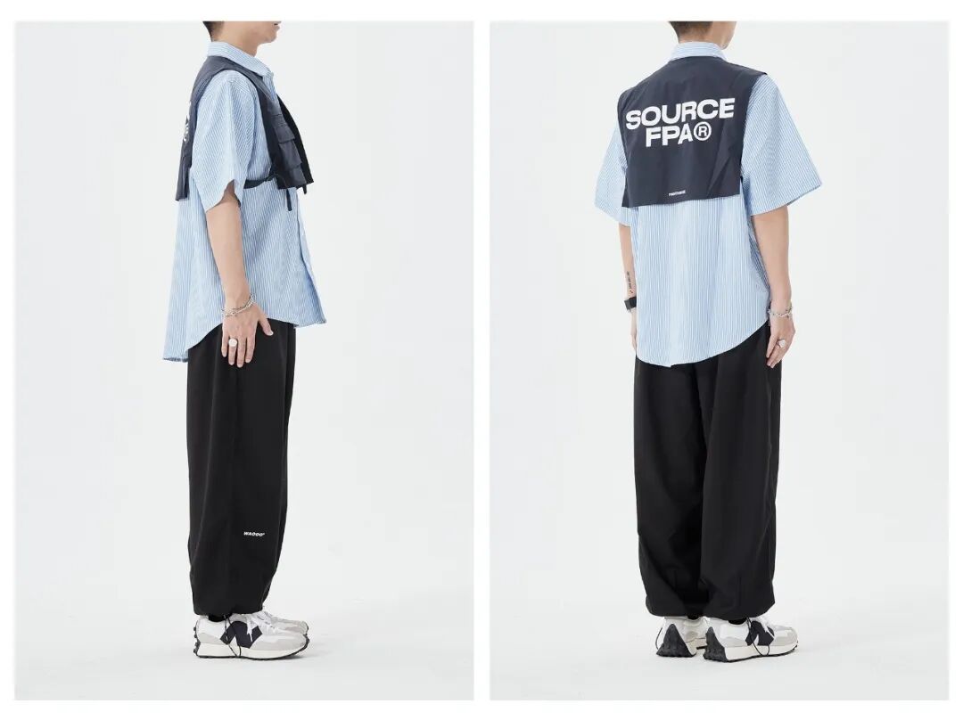 因为选择了宽松的武士裤,穿搭整体会显得比较休闲,让这件设计感满满的假两件衬衫也非常好出街;配色上也是深色+浅色+深色的奥利奥法则,稳如老狗。