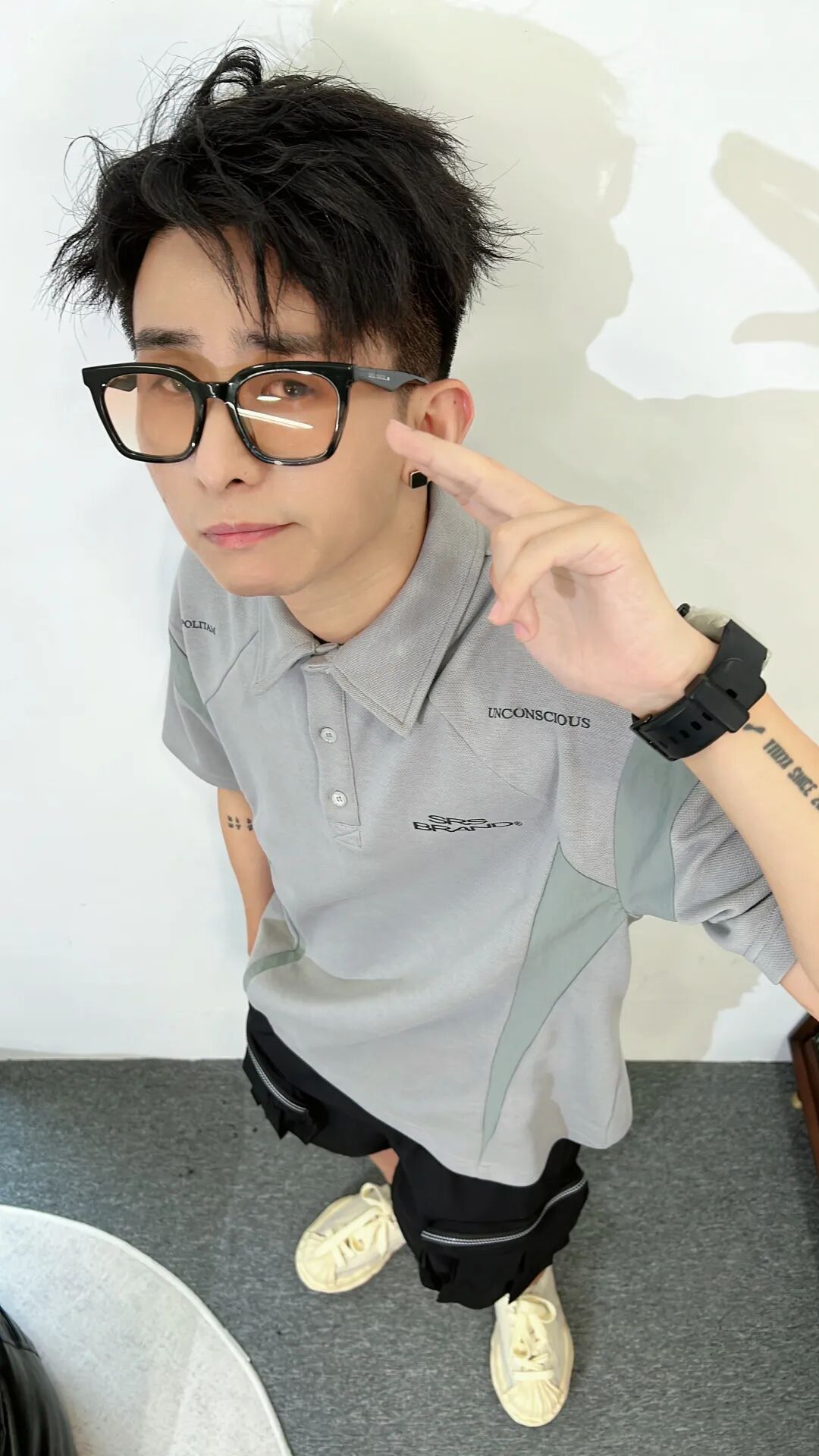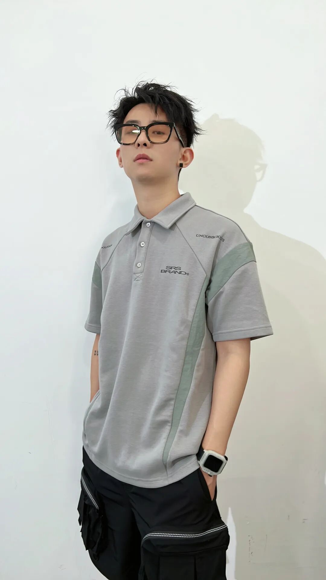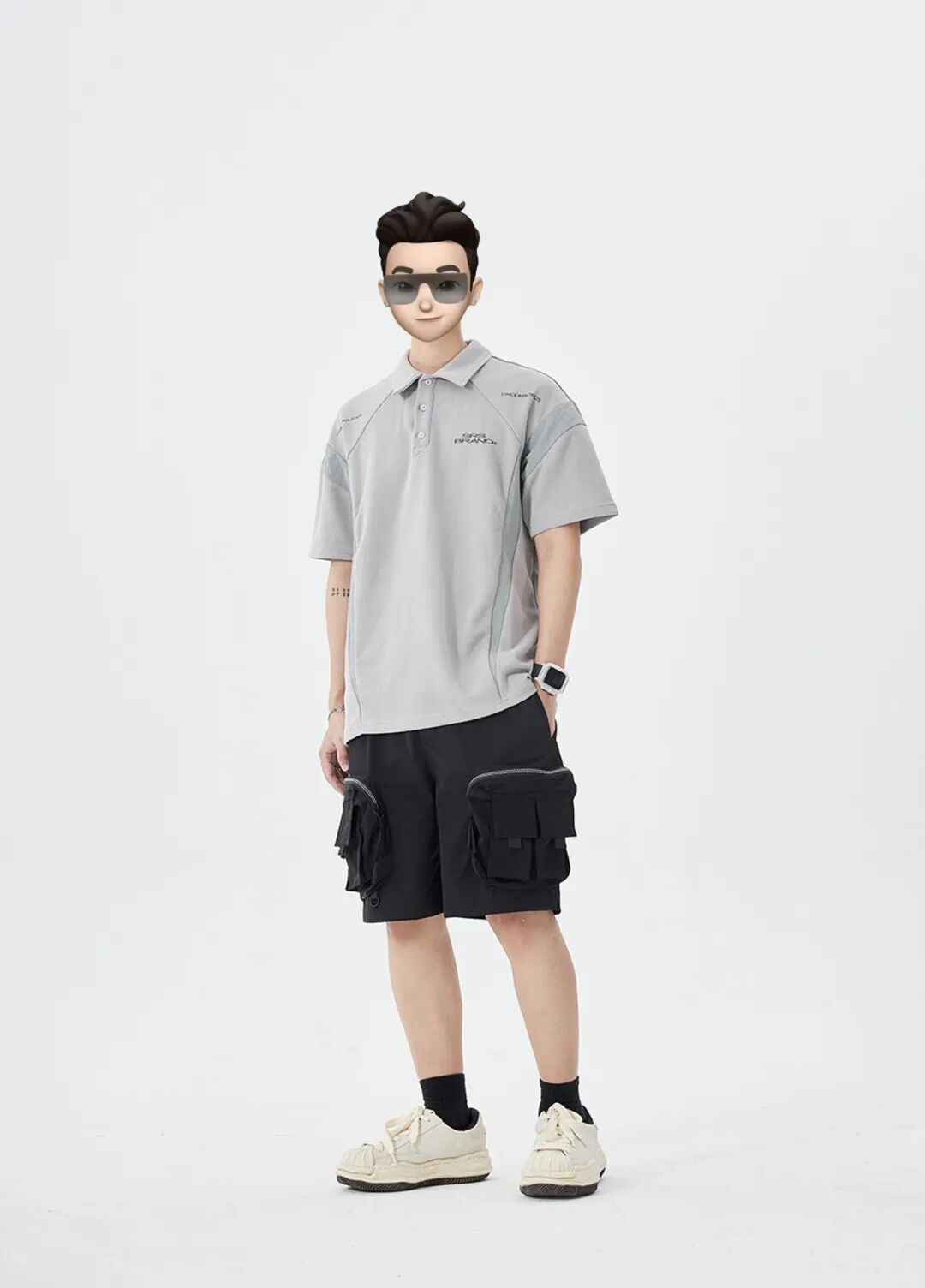 上身一件灰色弧度拼接polo短袖,下身搭配碳黑色机能运动大口袋五分裤,脚踩一双白色多嘴驴厚底贝壳头溶解鞋,压稳重心!