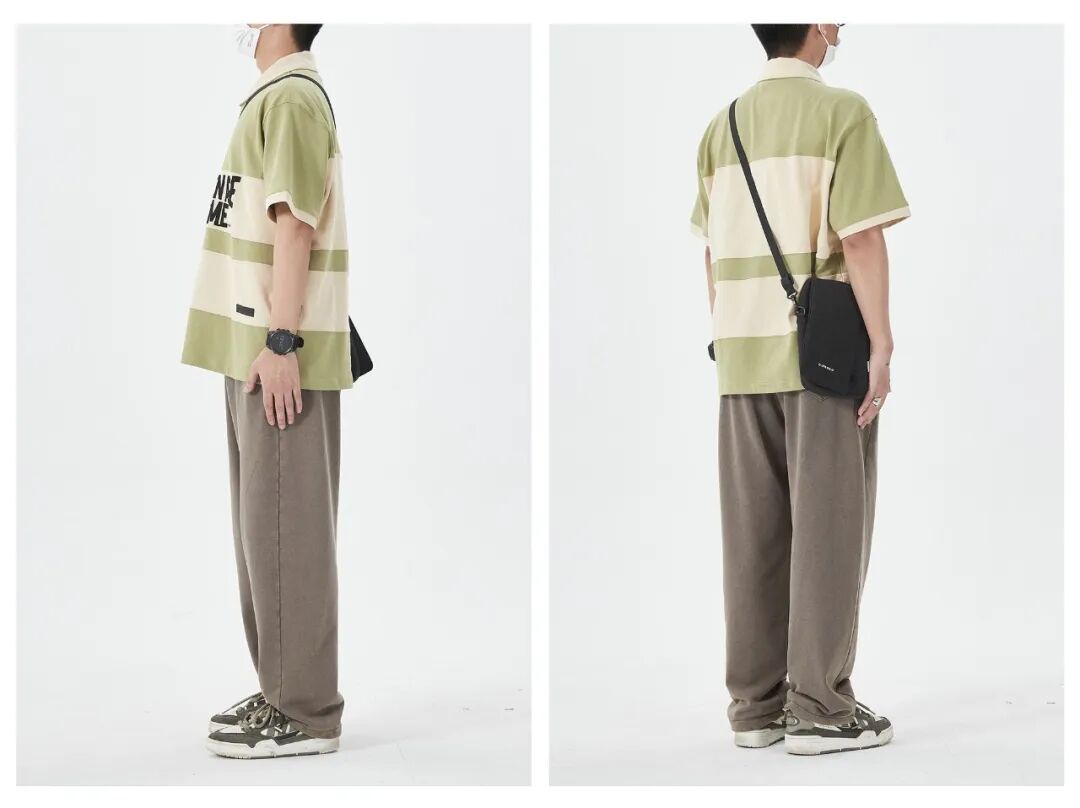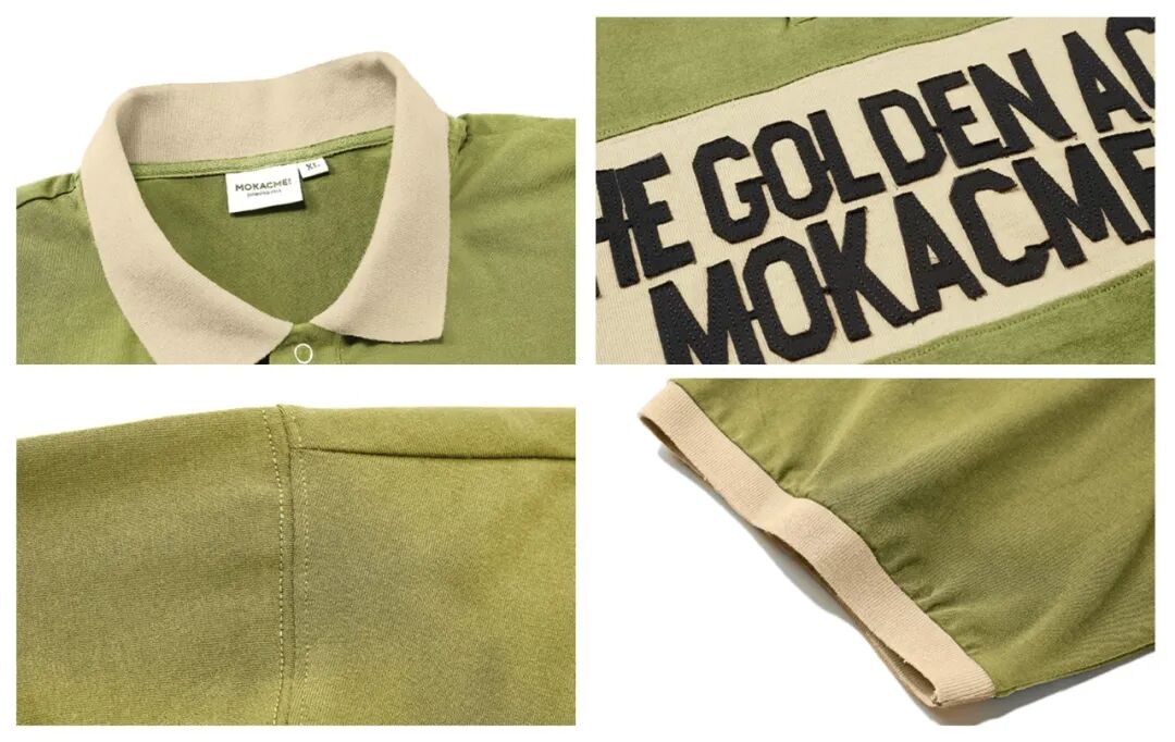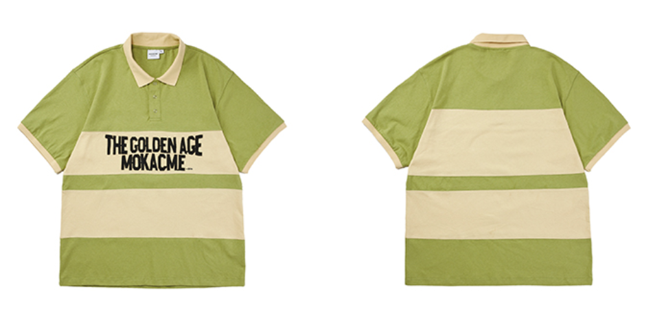 这件复古拼接Polo衫,灵感来自80年代的街头穿搭,宽松的oversize版型设计,上身真的很有范儿!胸前的slogan采用的是贴布绣工艺,加上绿色和卡其的拼接,复古质感很强,重点还不太挑裤子了,直筒的、阔腿的长裤或短裤,搭配起来都足够好看!