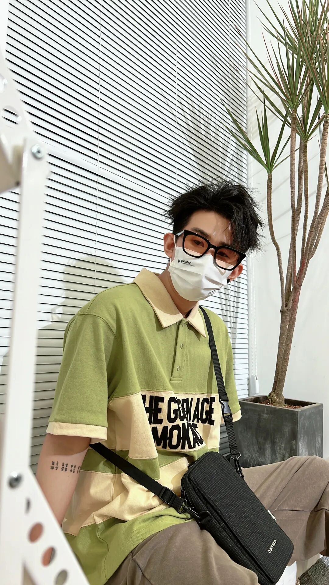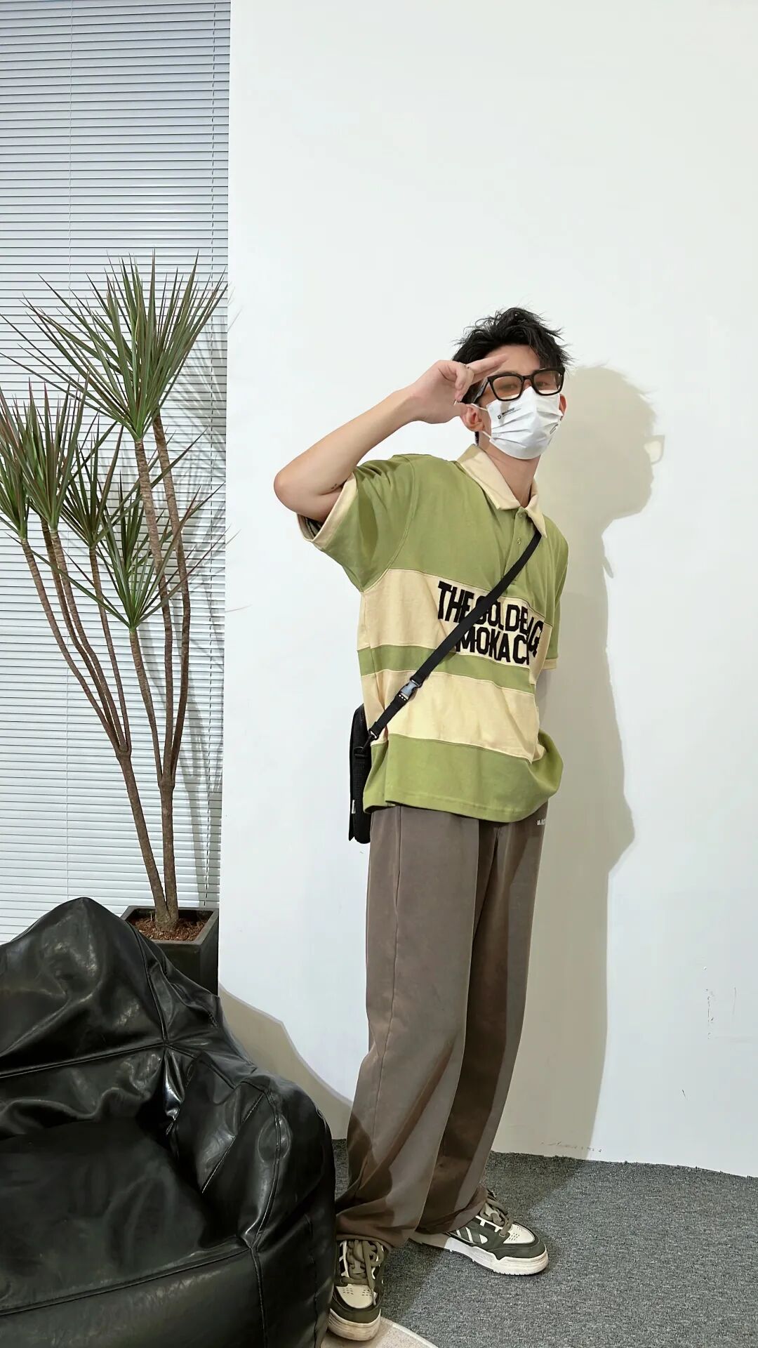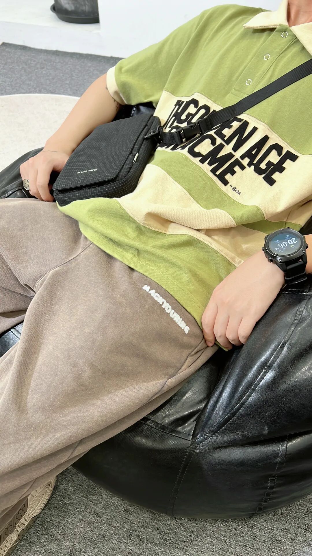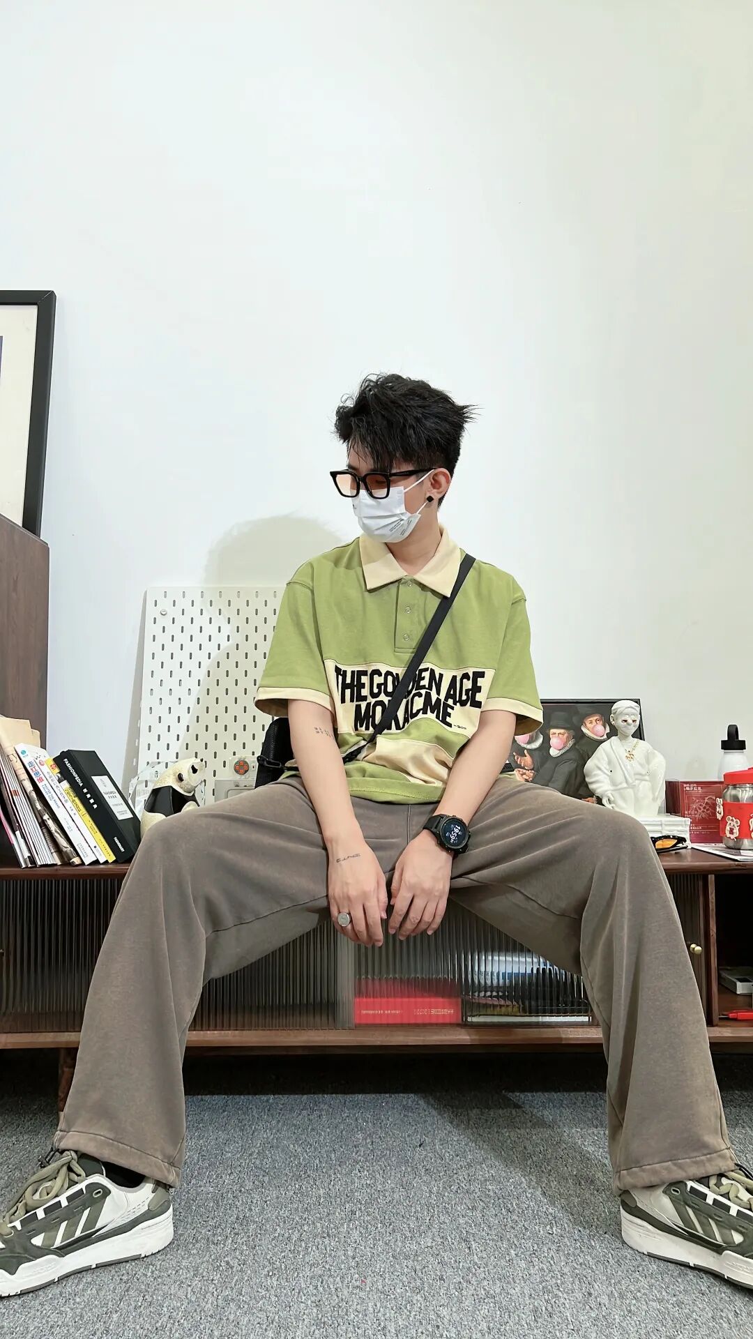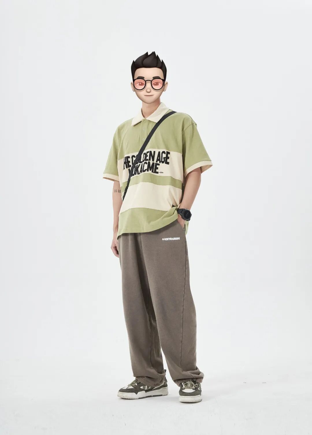 上身一件卡绿拼接贴布绣复古Polo马球衫,下身搭配一条咖色直筒抽绳针织卫裤,再上脚一双复古配色的休闲板鞋,最后搭配一个夏日感十足的竖款斜挎包!