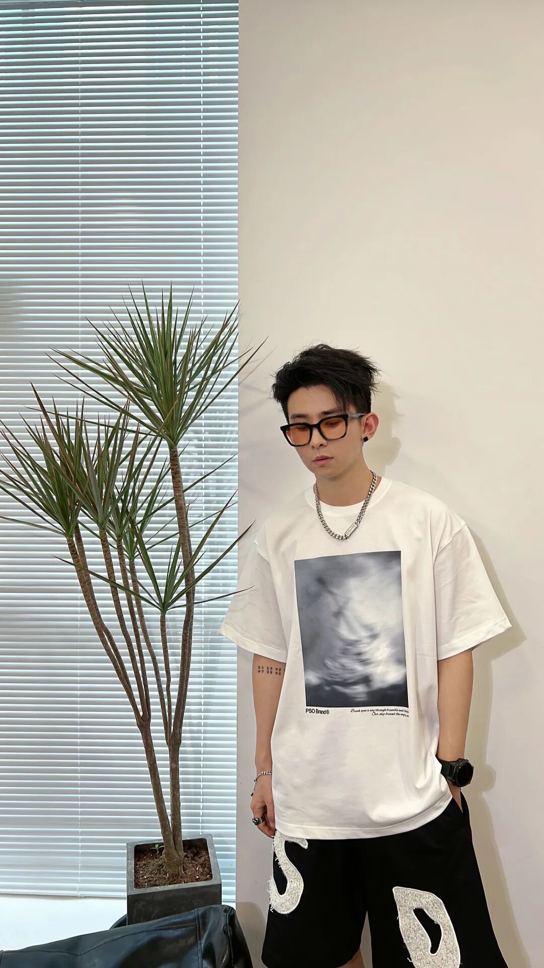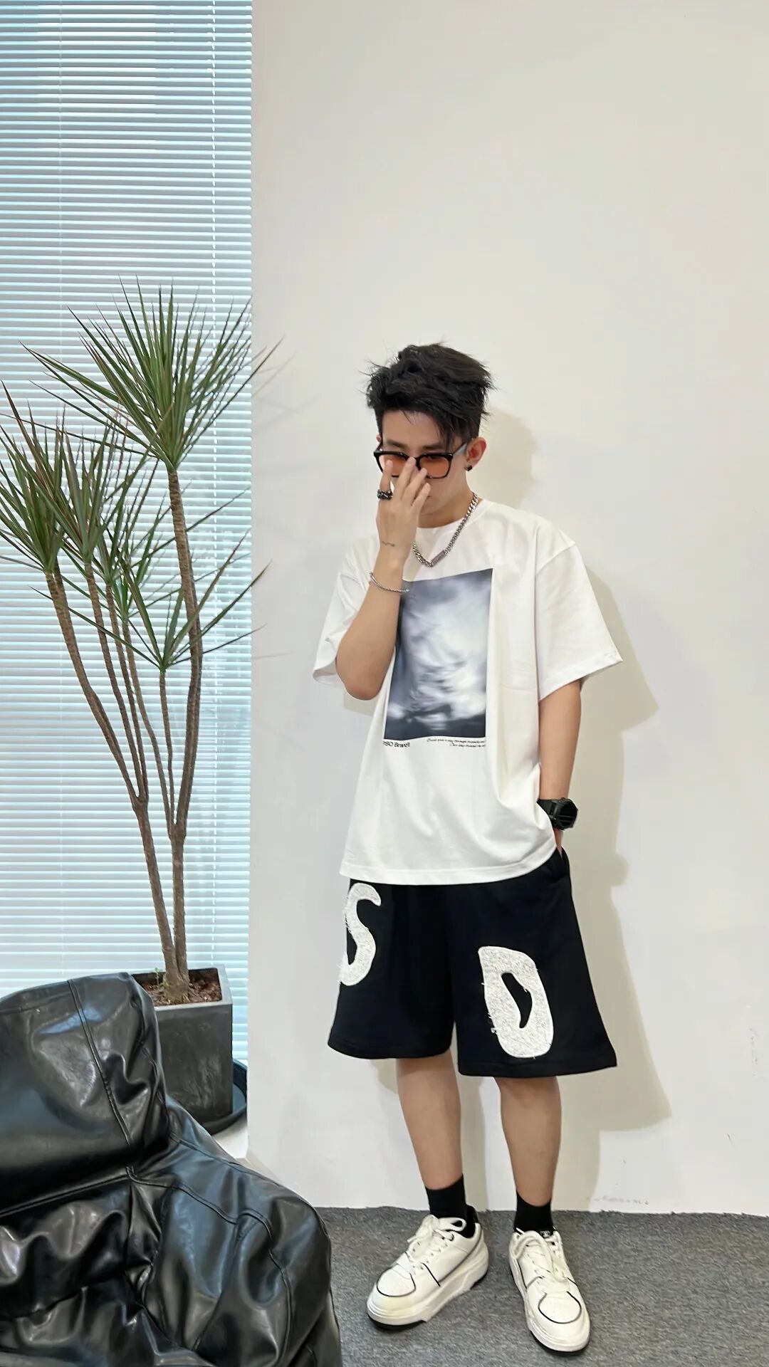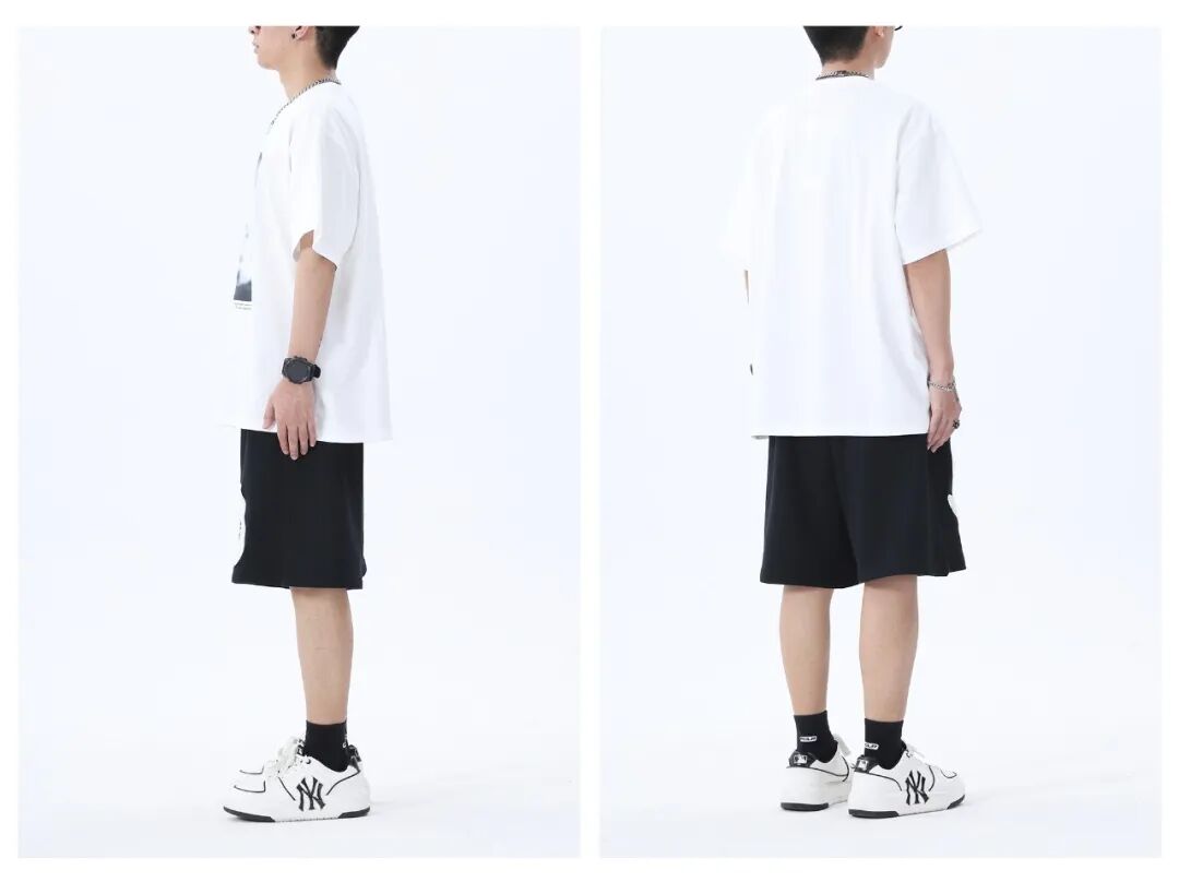上身一件280克重磅纯棉的象牙白模糊风景印花短T,下身搭配黑色趣味设计植绒字母五分裤,最后上脚黑色袜子搭配白色MLB厚底板鞋,与服饰进行颜色呼应!