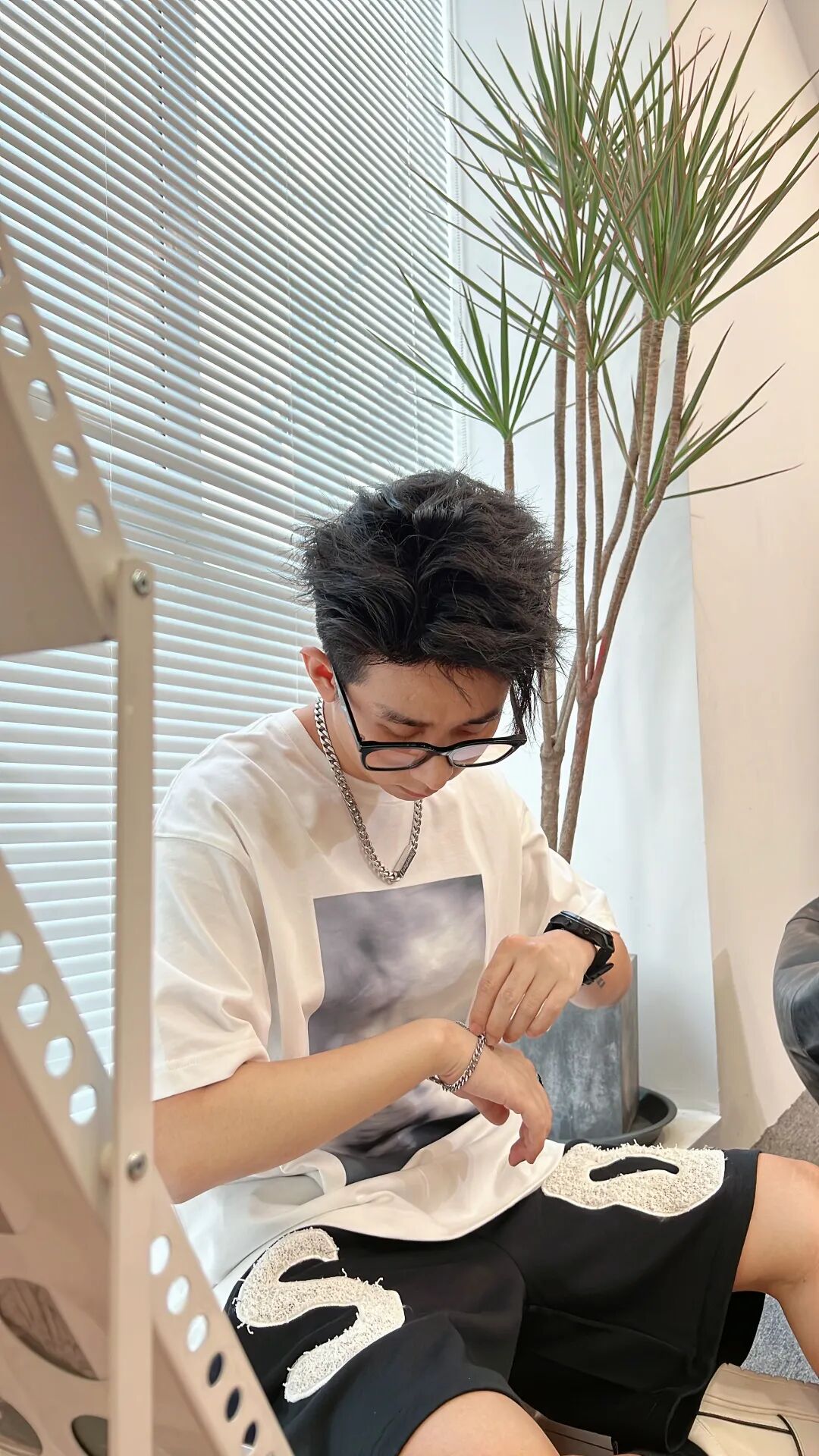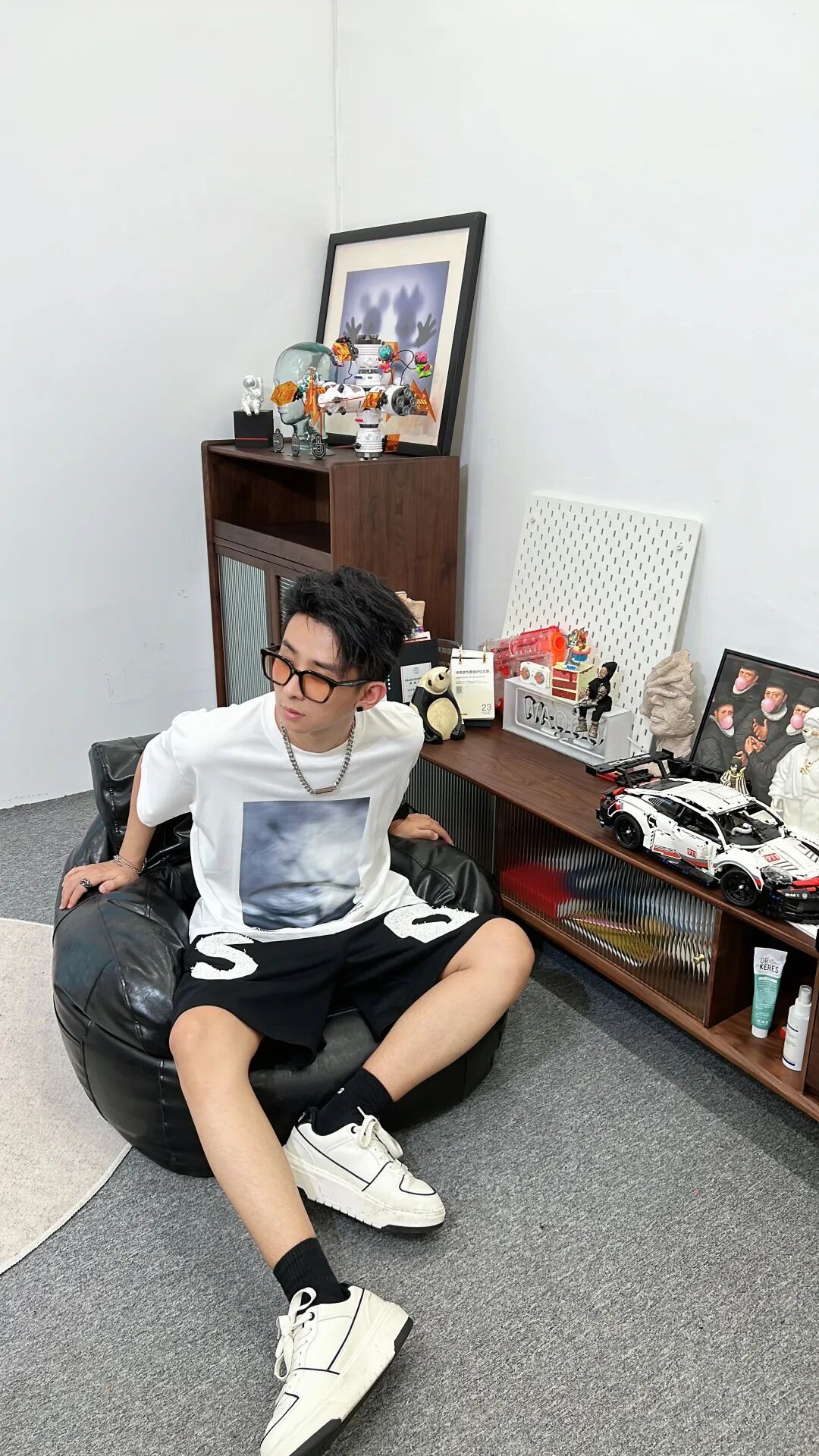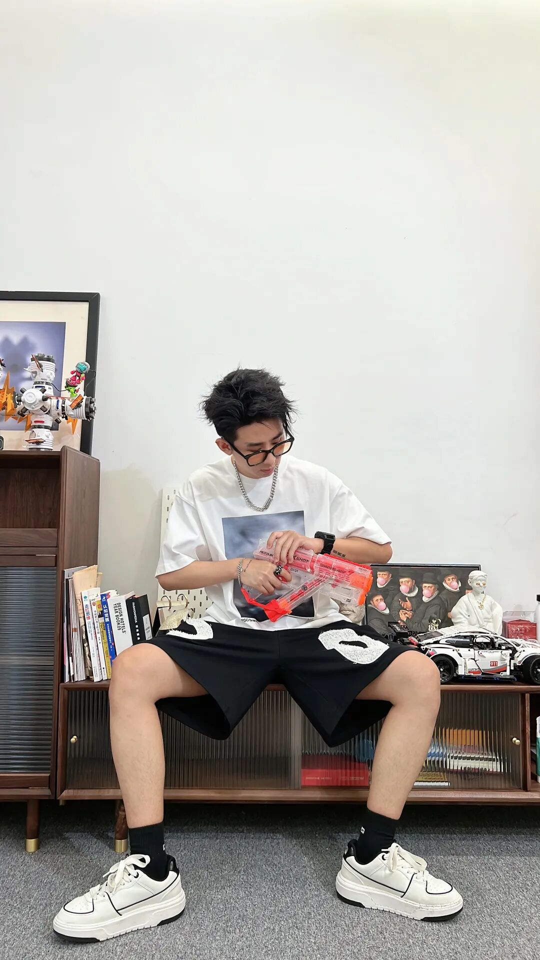 上身一件280克重磅纯棉的象牙白模糊风景印花短T,下身搭配黑色趣味设计植绒字母五分裤,最后上脚黑色袜子搭配白色MLB厚底板鞋,与服饰进行颜色呼应!