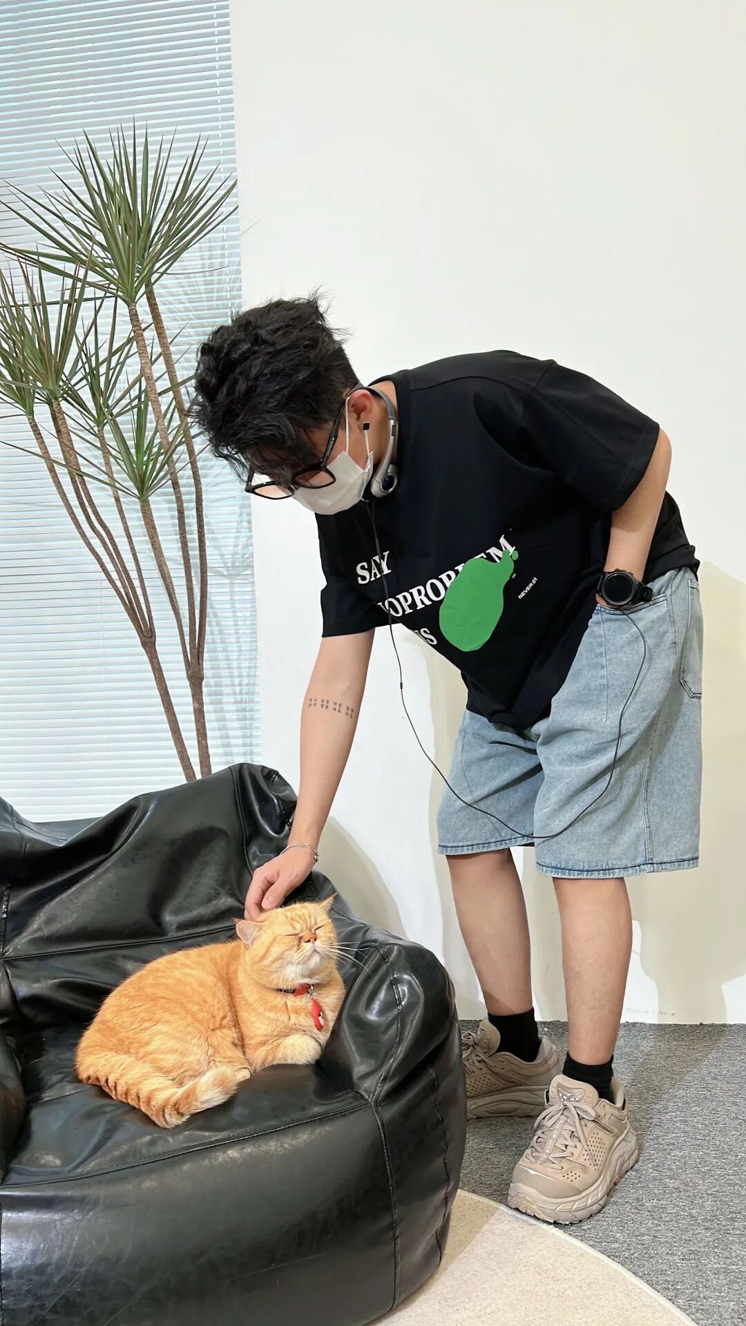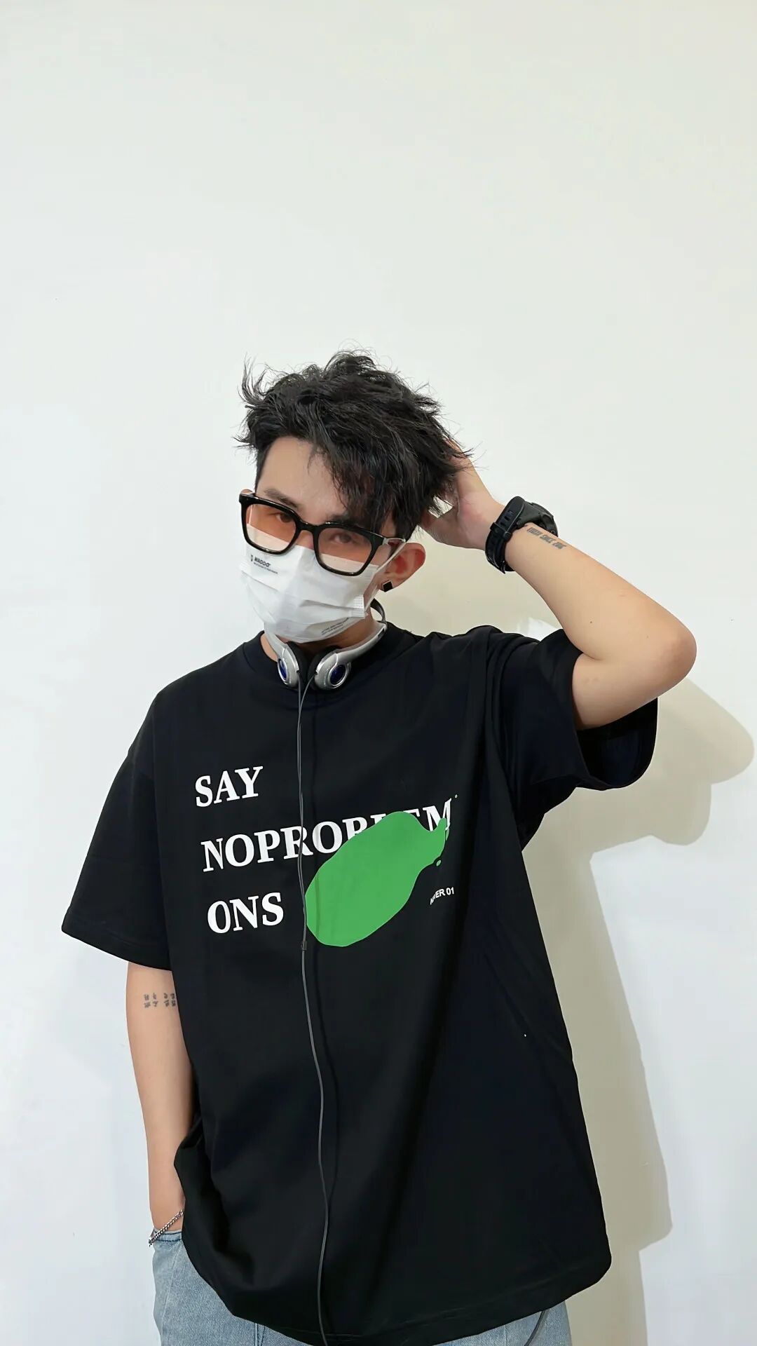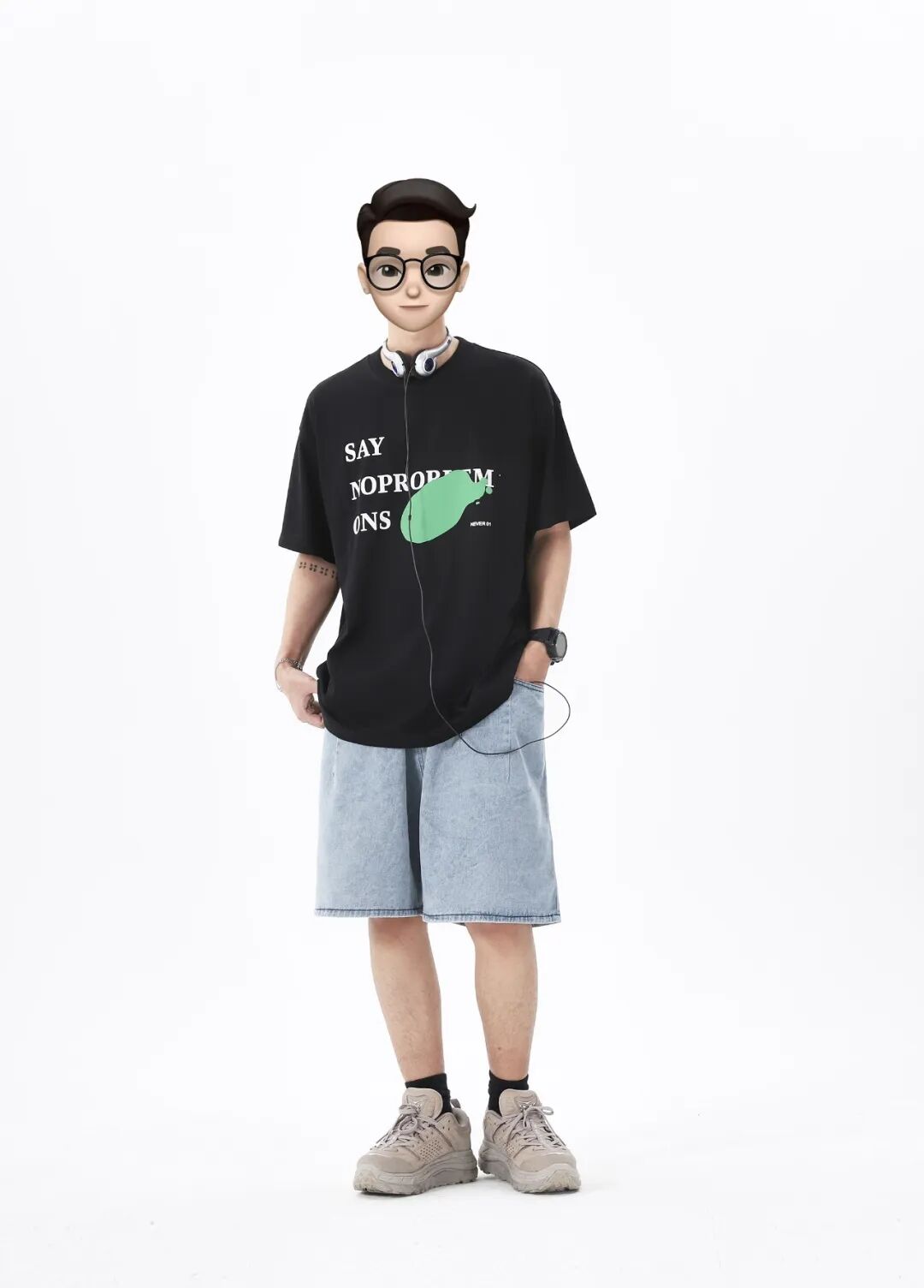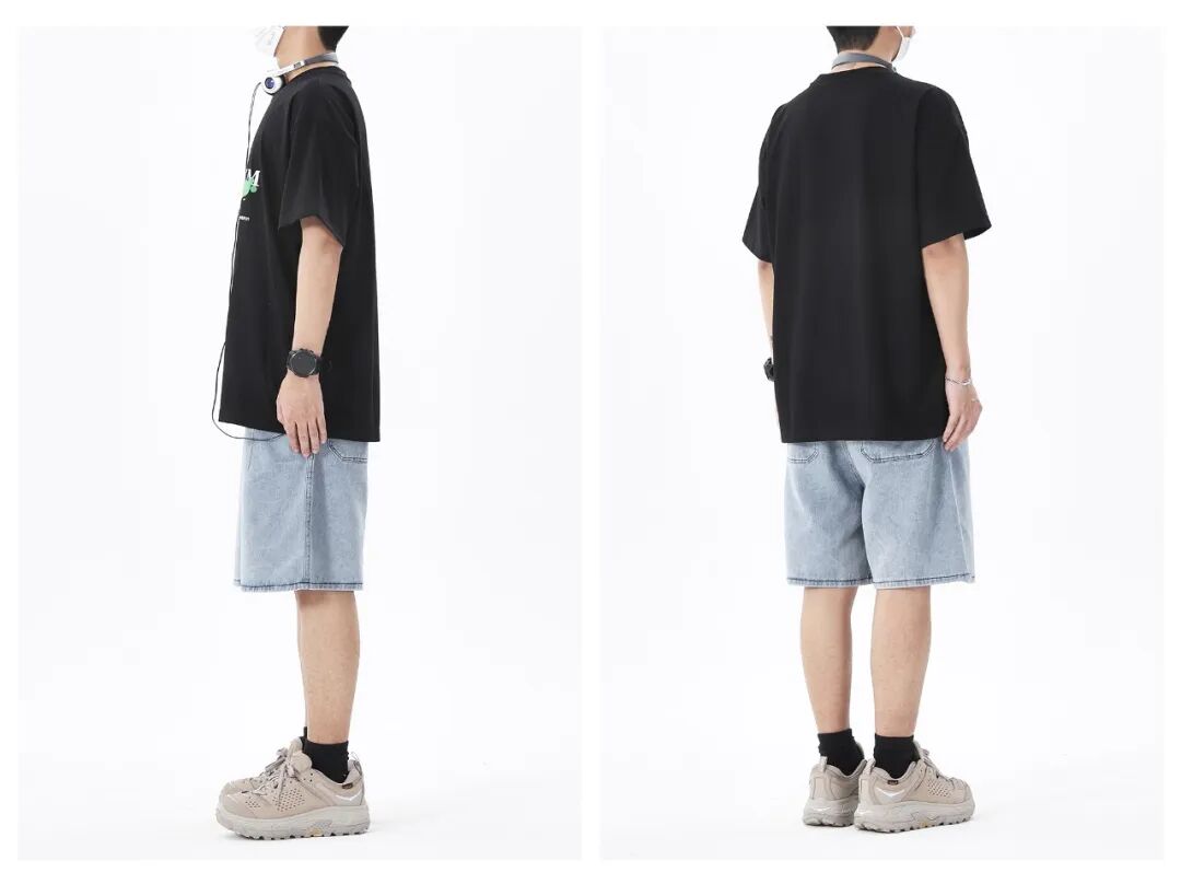 裤子的颜色和裤型都非常清爽,那么上衣也可以选择活力值高一些的单品,譬如这件黑中带一抹亮色的短T,穿上就很显年轻,最后搭配一个挂脖式耳机,直接摇身一变男大学生!