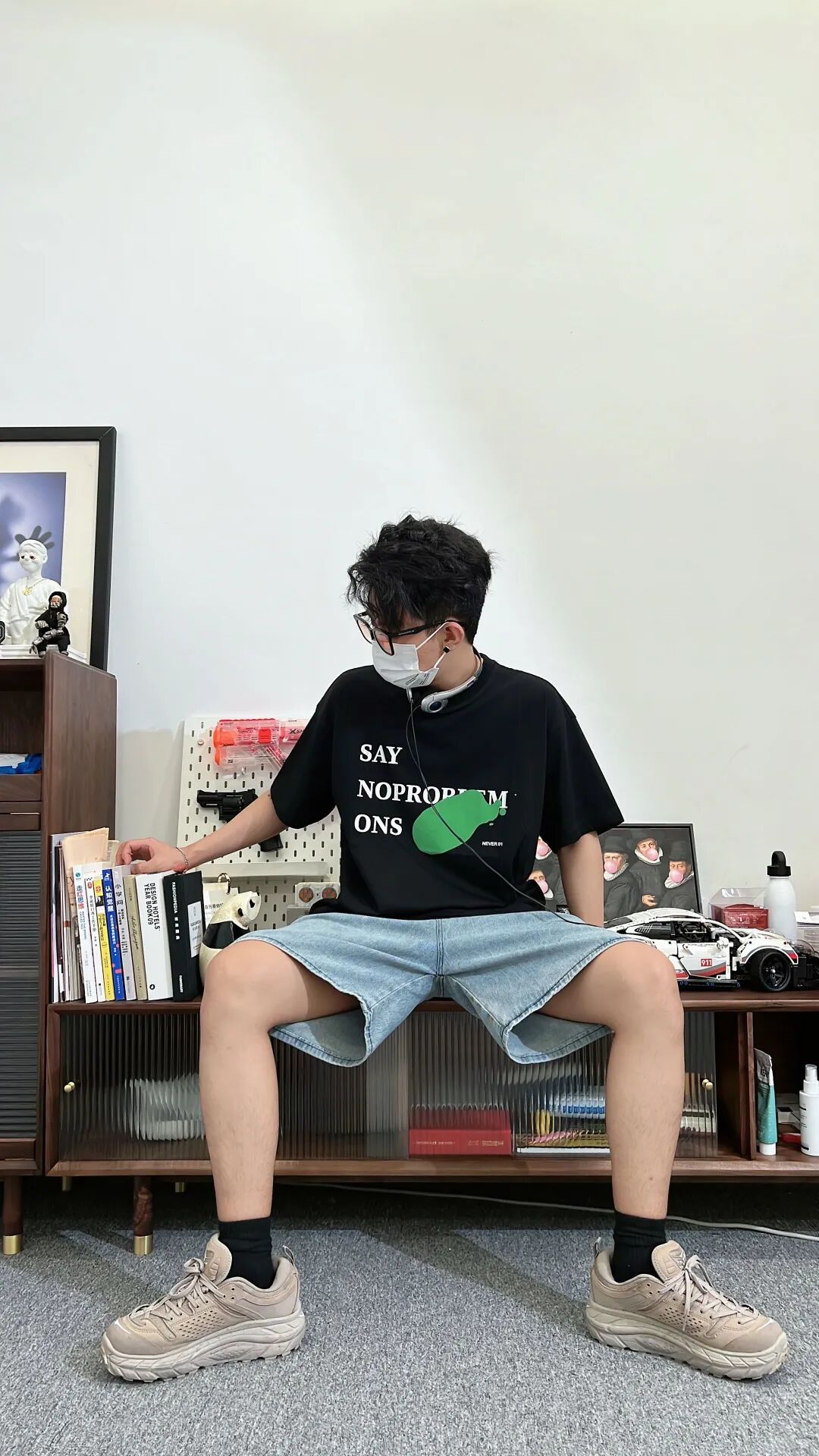 上身一件黑色文字印花圆领短T,搭配浅蓝色韩式水洗牛仔短裤,上脚黑色袜子呼应上衣,最后脚踩一双低帮卡其色Hoka户外徒步鞋。