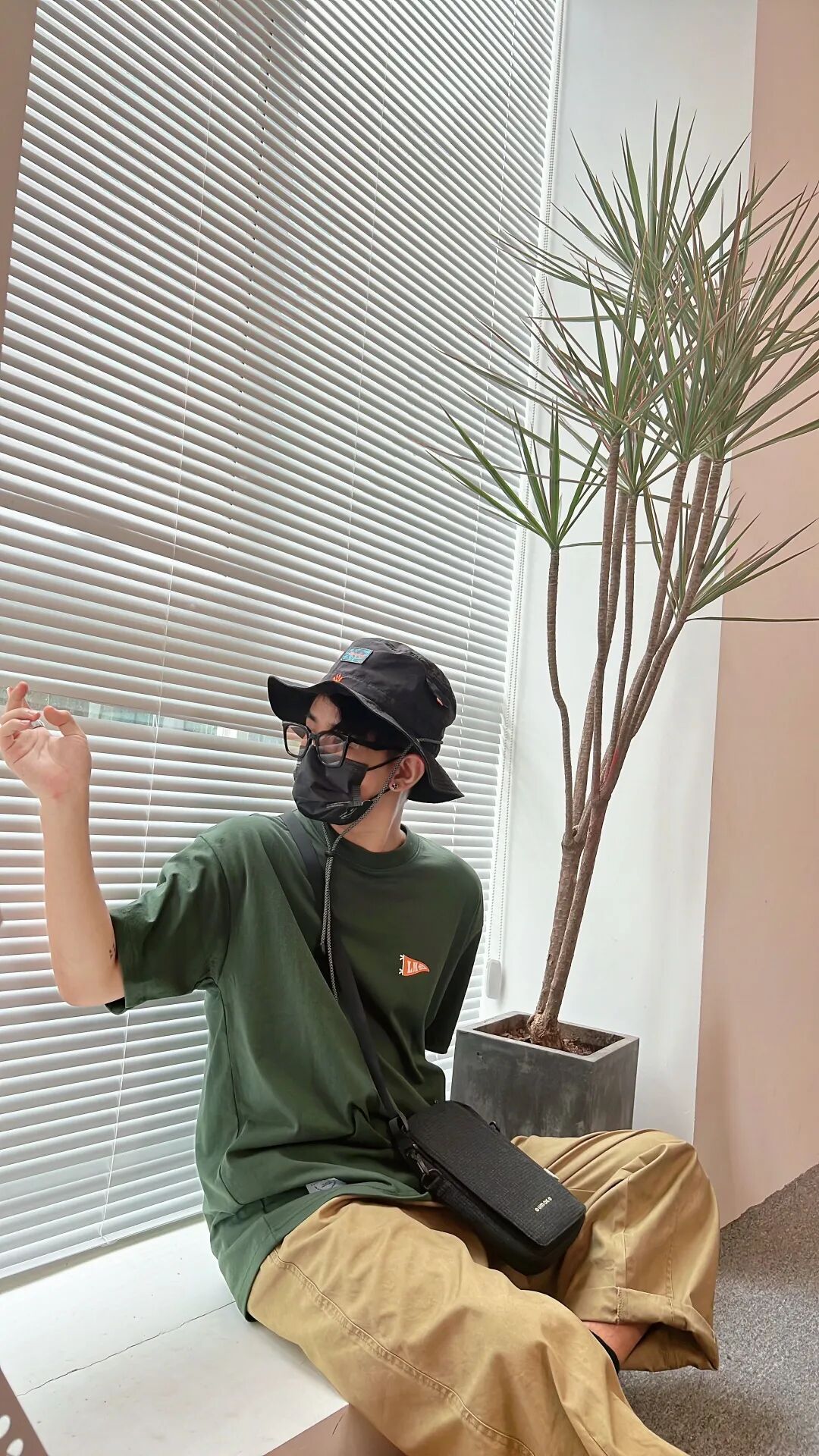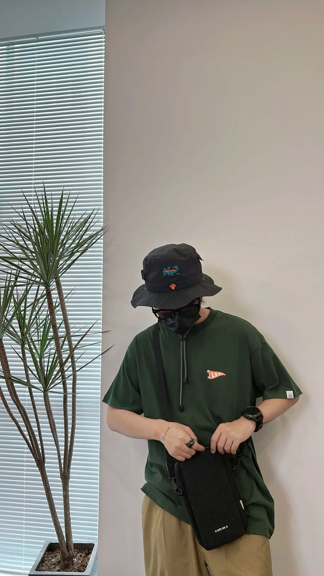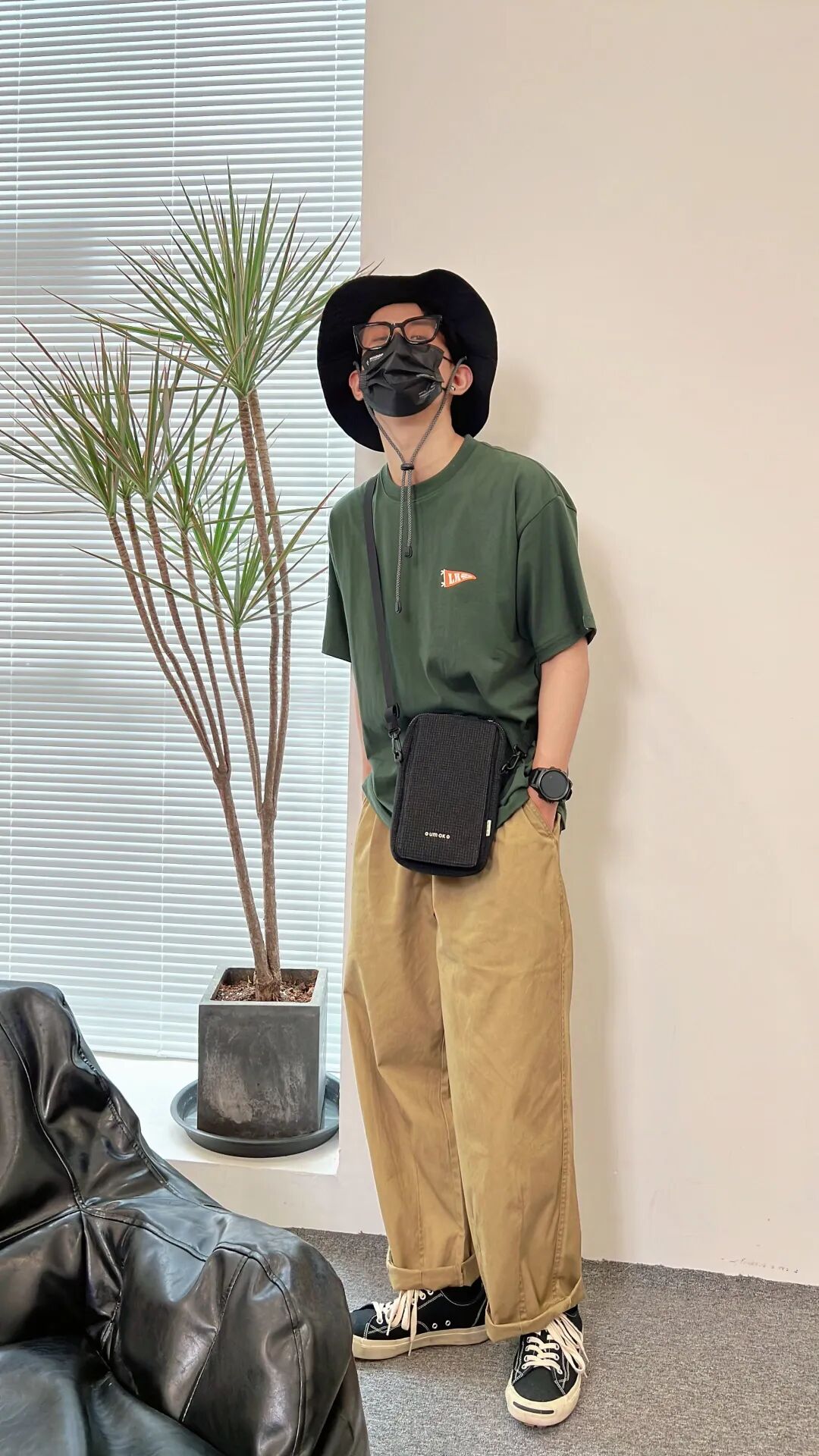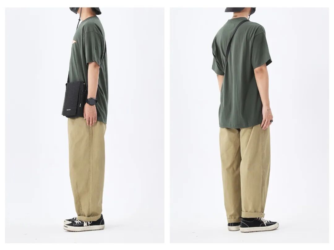 上身一件军绿色日系宽松圆领T恤,搭配卡其色日系宽松直筒休闲工装裤,上中下分别用渔夫帽、斜挎包、帆布鞋3件黑色单品串联,平衡画面,相互呼应。