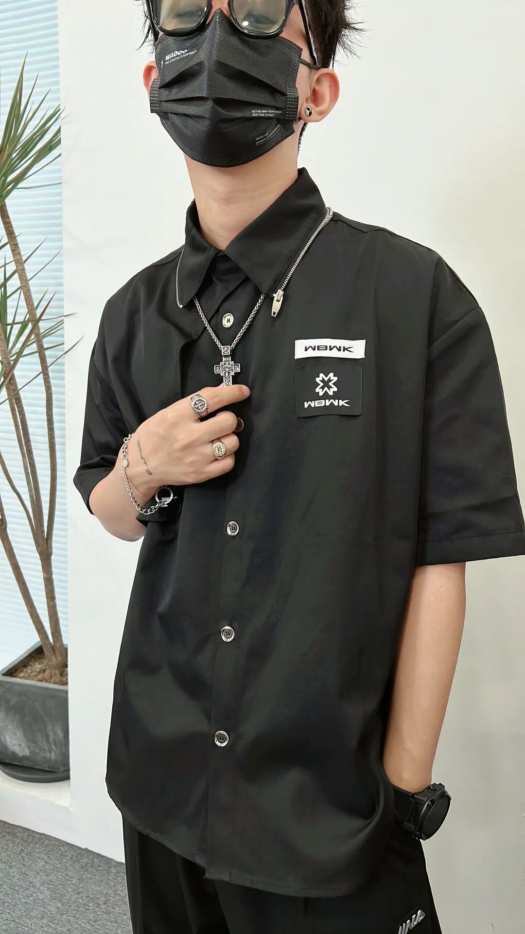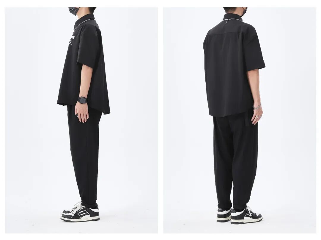 上身一件个性十足的黑色拼接设计短袖衬衫,搭配设计款暗黑休闲九分哈伦裤,最后上脚一双黑白配色的AMIRI Skel-Top骨头鞋,活力值直接拉满!