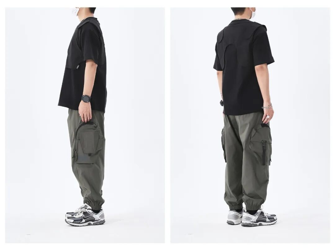 相比起印花,我觉得版型和设计更能表达机能风,像今天炫酷的短袖马甲假两件,以及功能性拉满的大口袋设计束脚裤,就比较到位,随便搭配一双球鞋或者复古跑鞋版型的鞋子都可以!