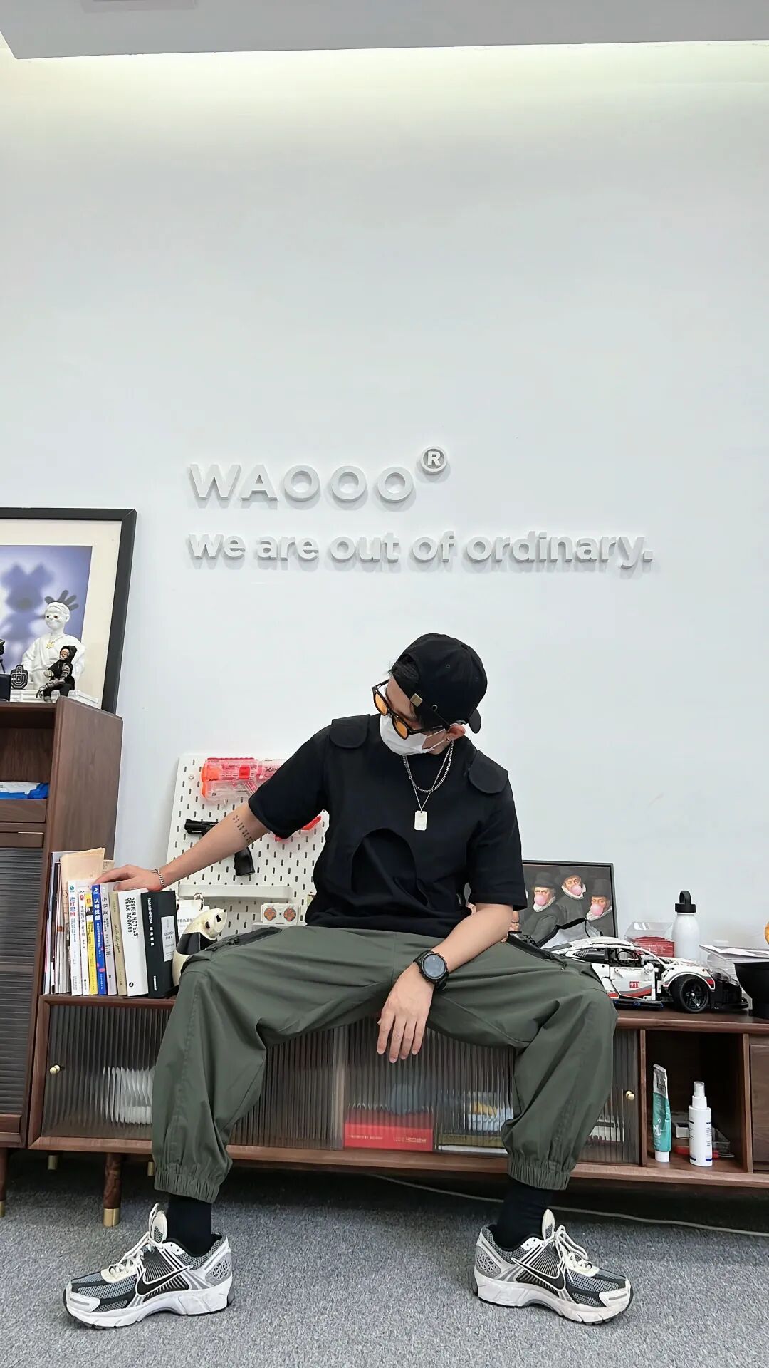 上身一件黑色机能风短袖马甲假两件潮T,搭配军绿色机能设计大口袋束脚裤,最后选一双黑白配色的Nike Zoom Vomero 5 SE SP上脚,活力满满!