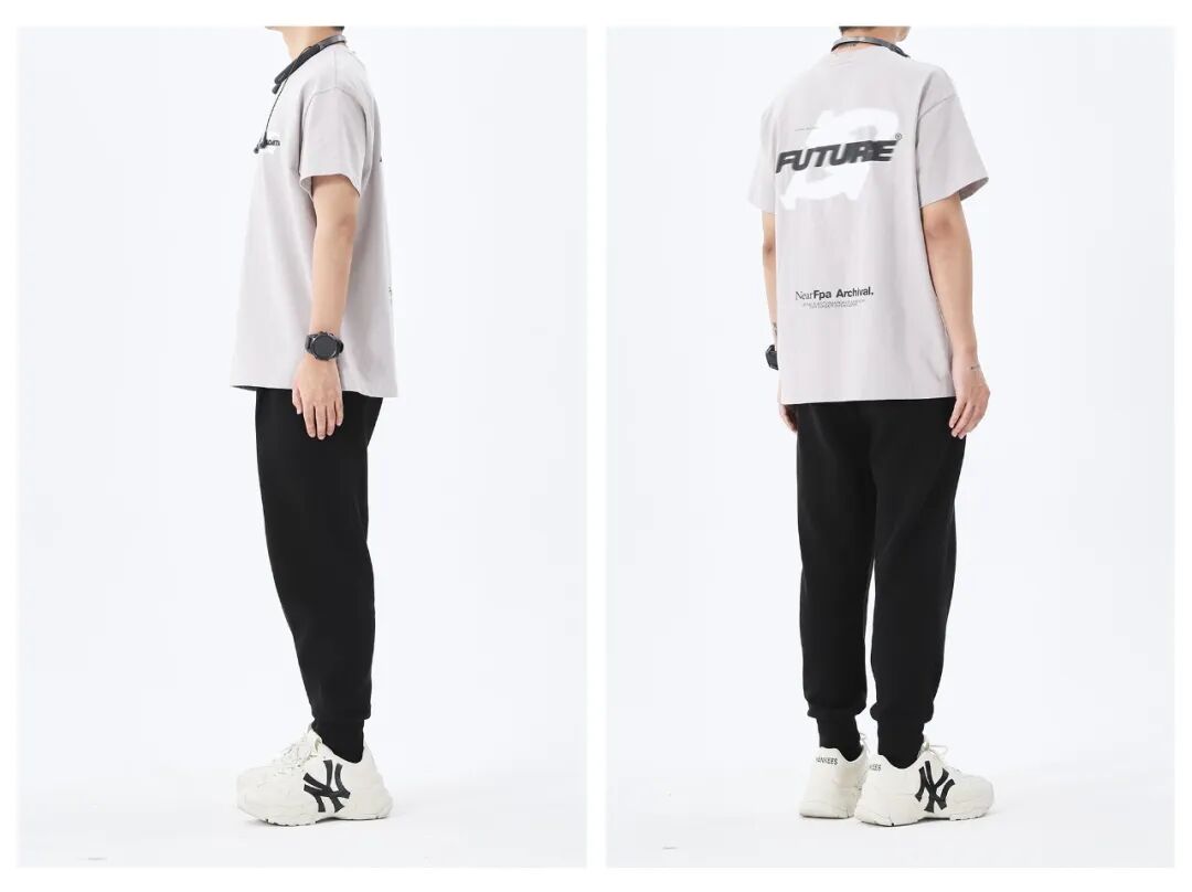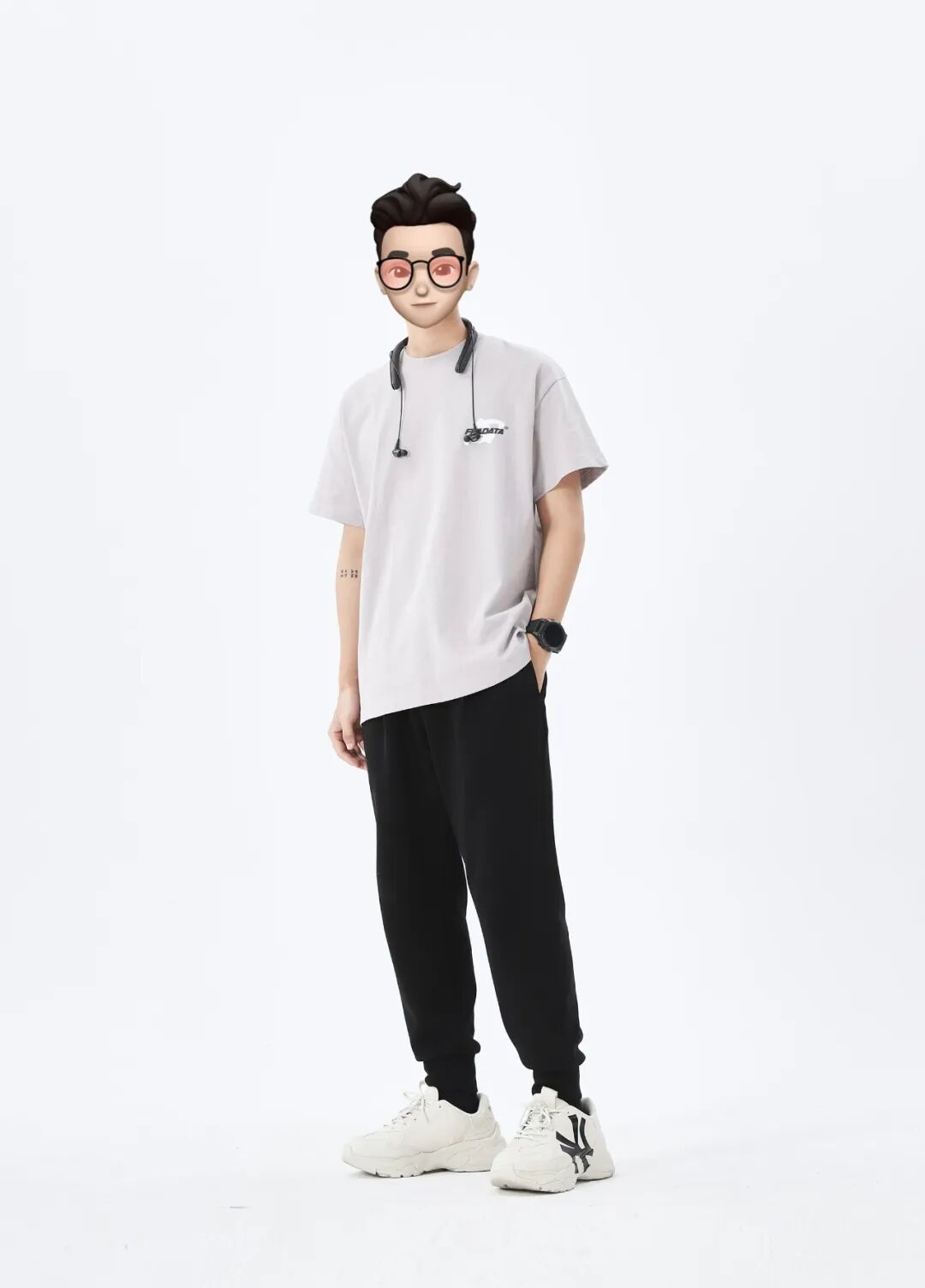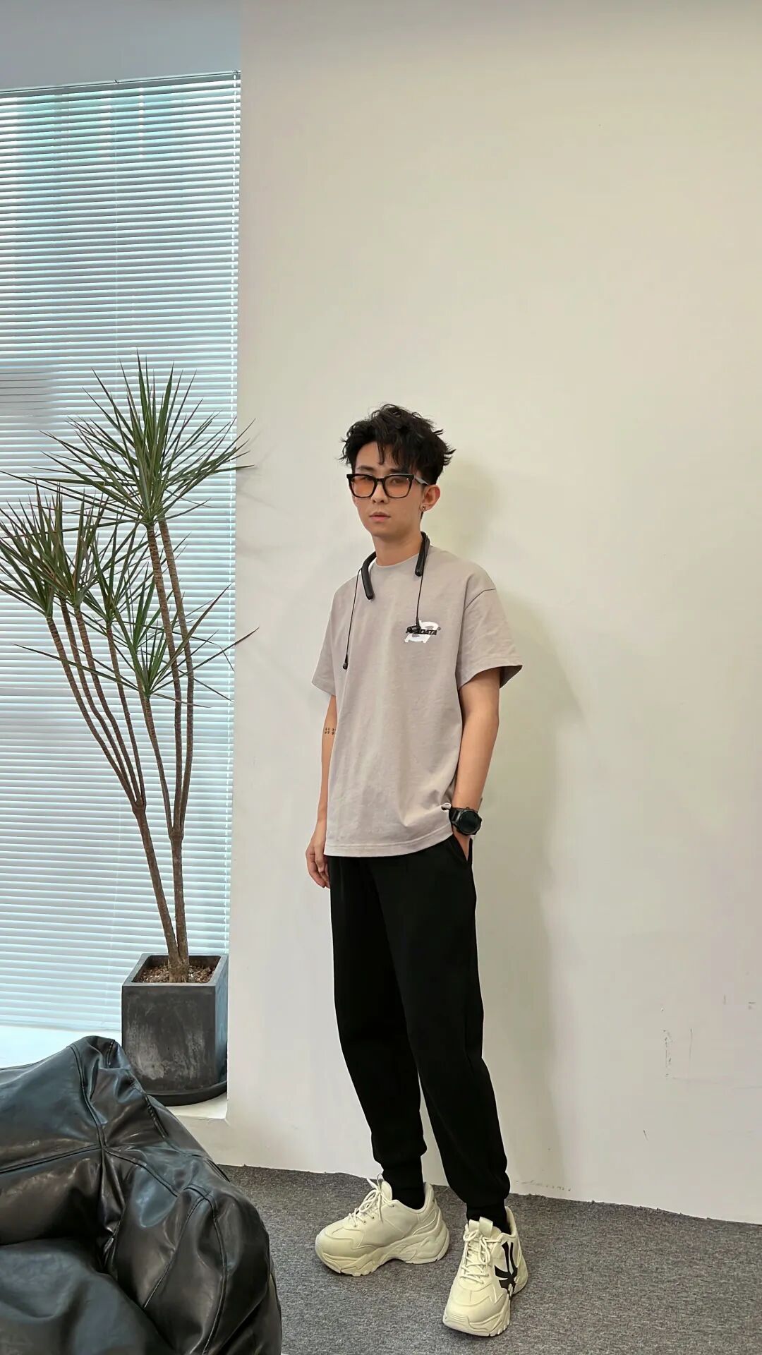 上身一件灰色模糊图形排版宽松短T,搭配炭黑色的基础款针织螺纹束脚卫裤,最后上脚一双米黄色的MLB复古老爹鞋。