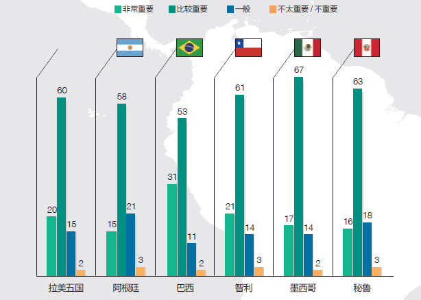 分国家来看,巴西和墨西哥受访者对中国和本国关系的重要性认可度最高,为84%;有82% 的智利受访者和79%的秘鲁受访者认为本国与中国的关系很重要;阿根廷受访者对中阿关系的重要性认可度相对较低,但认可比例也达到73%。