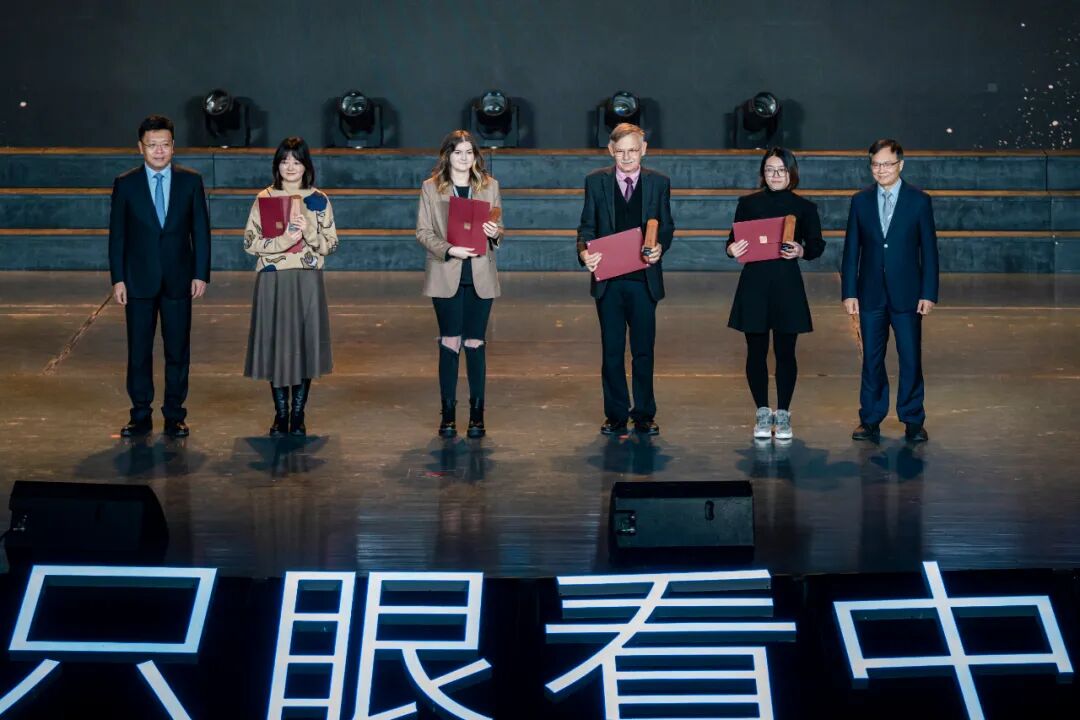 ▲山东省委宣传部对外传播处副处长于健、哔哩哔哩网站公共事务副总监冯越为《“老外”在中国》单元获奖代表颁奖。