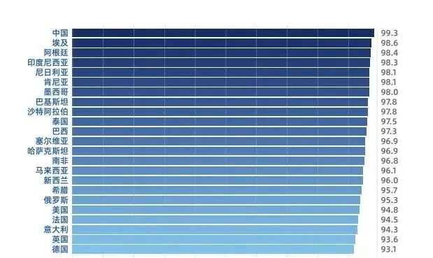 中国民主实践效能得到人民高度认可,人民获得感幸福感安全感不断增强。中国特色社会主义民主的实践效能得到本国人民高度认可。调查显示,中国民众对本国政府的信任度认同度达到99.8%,在受访23国中高居首位。85.8%的中国民众认为在近5年经济发展中的获得感更高,95.8%认为社会贫富差距明显缩小,96.3%认为生态环境不断改善,94.5%高度欣赏本国文化,93.3%认可本国政府的反腐败力度,显示出中国人民的获得感幸福感安全感显著提升。