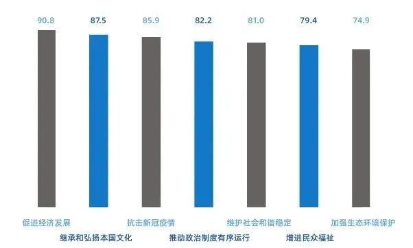中国共产党的领导地位获得高度评价,中国政治决策高效稳定可持续。23国受访者认为中国共产党在促进经济发展(90.8%)、继承和弘扬本国文化(87.5%)、抗击新冠疫情(85.9%)、推进政治制度有序运行(82.2%)、维护社会和谐稳定(81.0%)、增进民众福祉(79.4%)、加强生态环境保护(74.9%)等方面,都发挥了关键作用。对于中国政治决策效率和效果,23国民众均表示“比较认可”“认可”或“高度认可”,认为中国政治决策具有高效、稳定、可持续等优势。