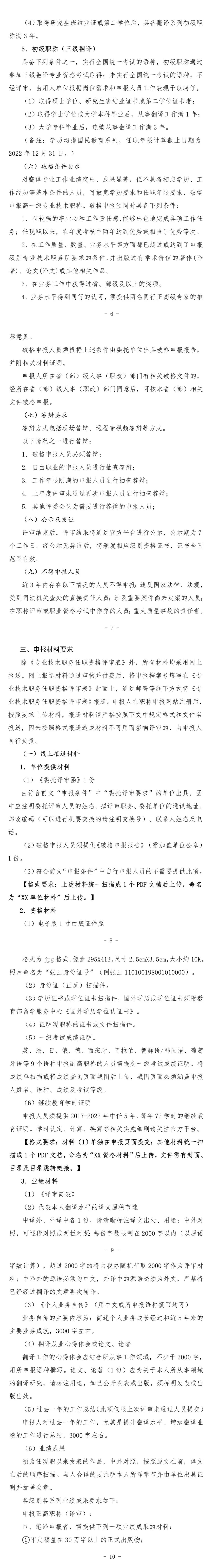 根据《关于深化翻译专业人员职称制度改革的指导意见》(人社部发〔2019〕110号),受国家人力资源和社会保障部委托,中国外文局牵头组建全国翻译系列高级职称评审委员会,负责开展全国范围的翻译系列高级职称评审工作。为做好2022年翻译系列各级别职称评审工作,现就有关事宜通知如下: