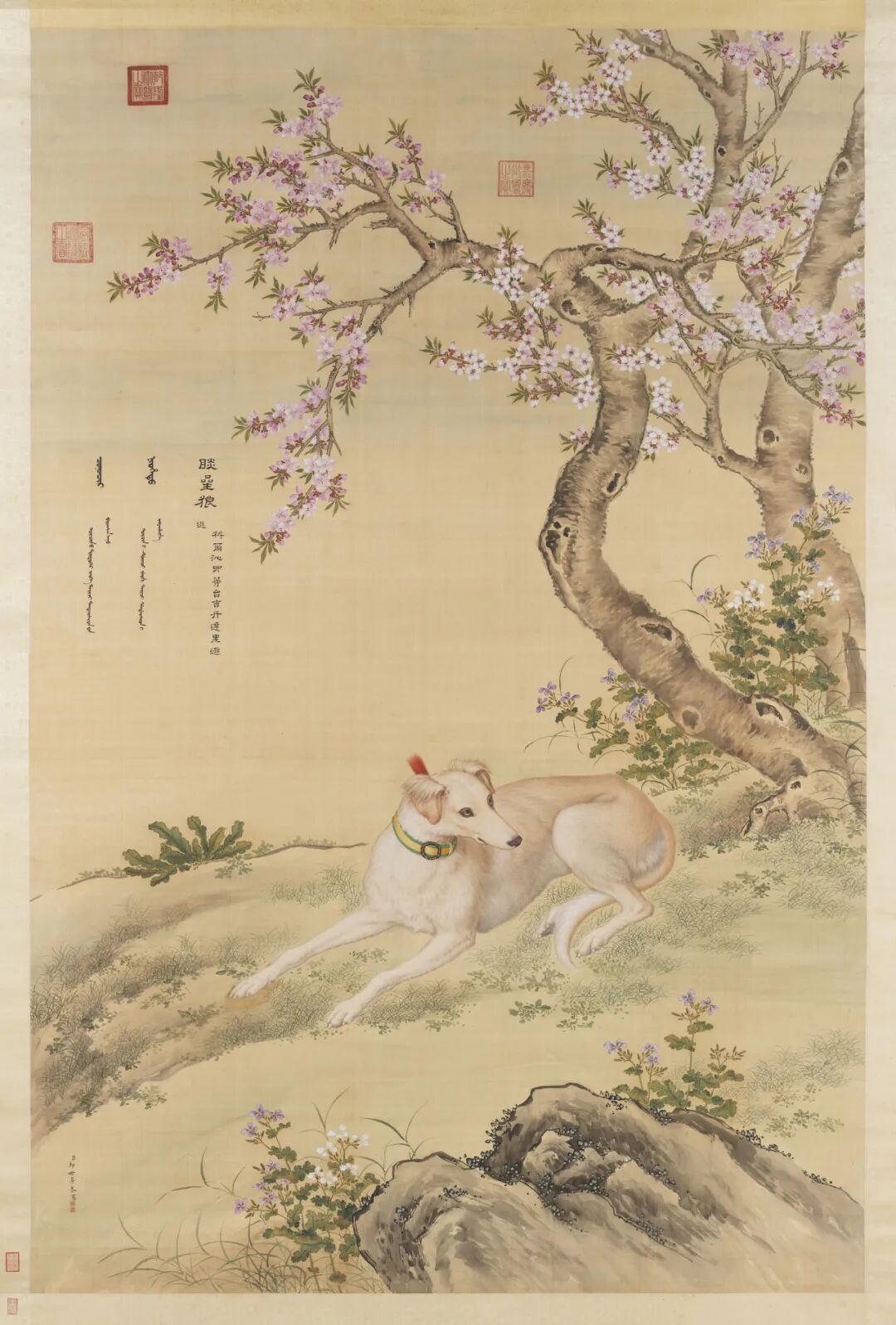 《十骏犬睒星狼轴》由清代西洋画家郎世宁所作。郎世宁将欧洲油画中的静物写生等技巧带到了中国,创作了一大批中西结合的艺术作品。画中一只蒙古部落进贡的名犬正机警地回头,身后桃花悄然飘落。