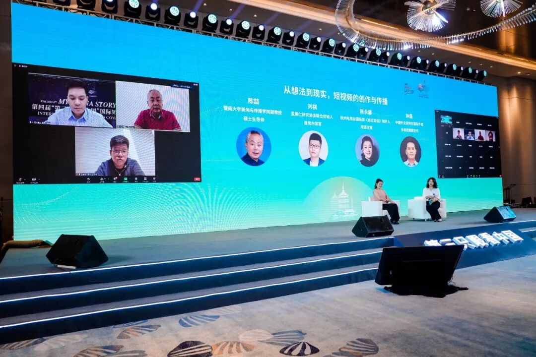 创享会现场,暨南大学新闻与传播学院副教授陈喆,歪果仁研究协会联合创始人、首席内容官刘祺,杭州电视台国际部《走近亚运》制片人、双语主播陈永馨,中国外文局煦方国际传媒多语视频部主任钟磊就“从想法到现实,短视频的创作与传播”展开圆桌讨论。