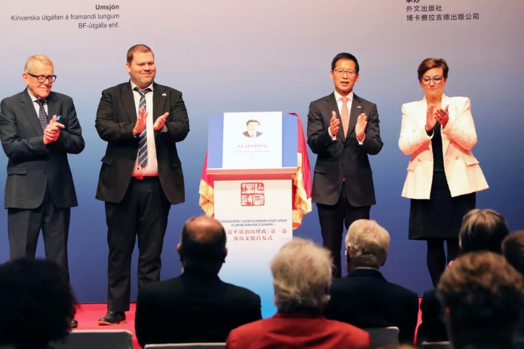 ▲何儒龙(右二)与冰岛嘉宾共同为《习近平谈治国理政》第一卷冰岛文版新书揭幕。