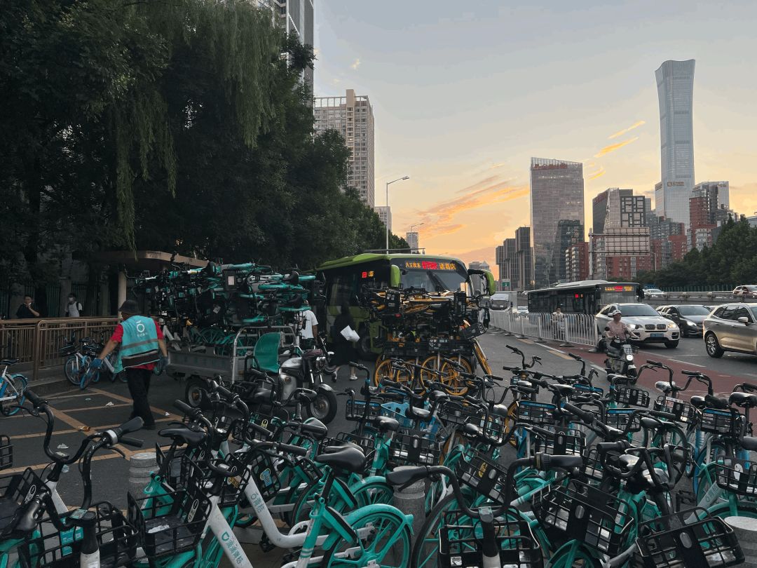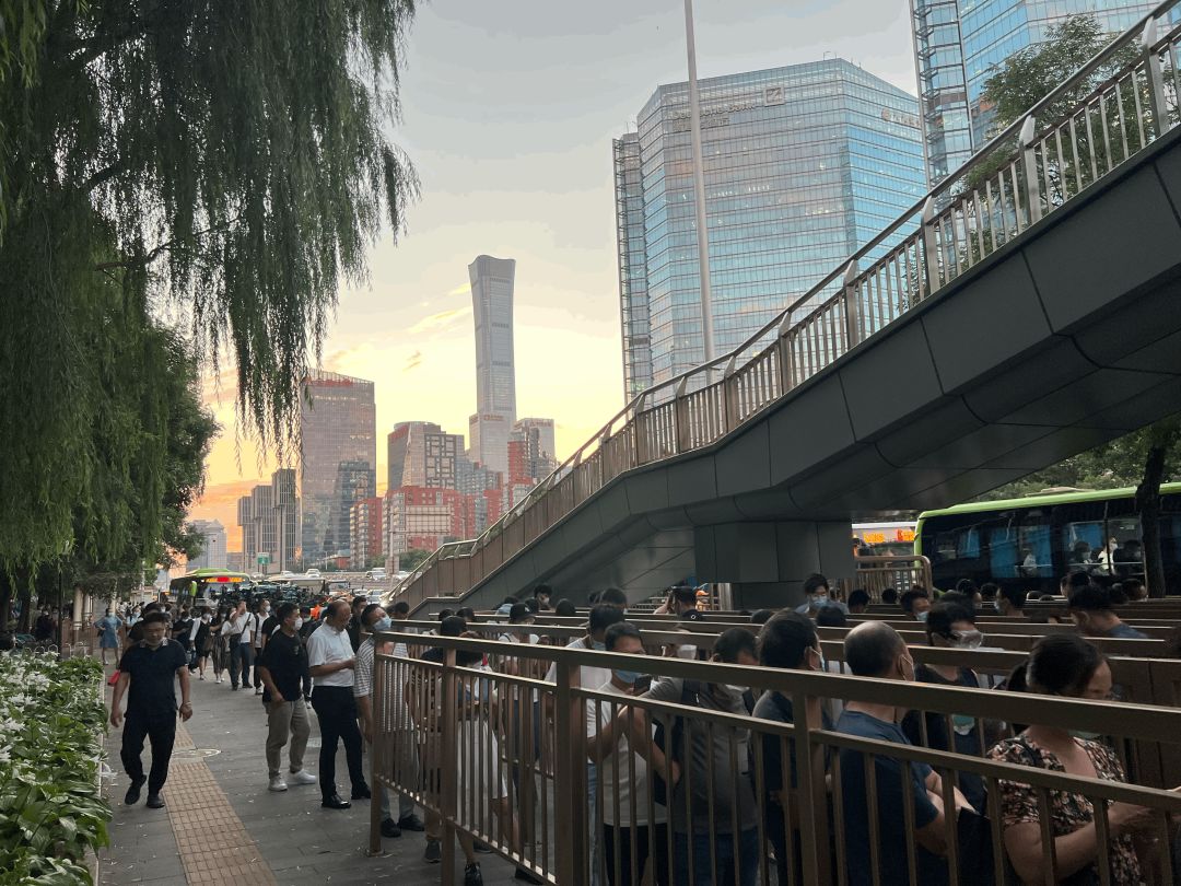 傍晚六点,打工者从各大写字楼奔涌而出,用力蹬着颜色各异的共享单车,面无表情,向着八王坟公交站奋力奔去。抵达公交站时,共享单车占满了人行道,身穿工作服的单车管理员早已准备好收拾装车。站牌下挤满了回家的CBD打工人,队伍盘旋曲折,足足三十多米,从六点到八点,断断续续,络绎不绝。
