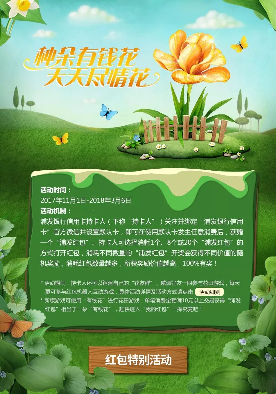游戏1:当持卡人成功进入游戏后,每位持卡人每天可以免费种植一朵“有钱花”,每天每任意消费一笔后可获得1次种植“有钱花”的机会,每人每天最多可种植五朵“有钱花”,持卡人种植“有钱花”后满24小时可额外长出一朵“有钱花”,持卡人需在额外长出的“有钱花”开花后的48小时内领取,如未领取则失效。“有钱花”种下后即开花,每朵“有钱花”被领取后即转换为一个“浦发红包”,持卡人可以正常打开并获得红包内含奖励,红包内含奖励及相应规则同“浦发红包”。