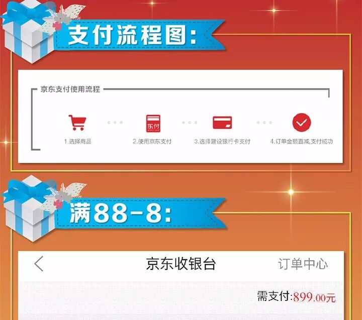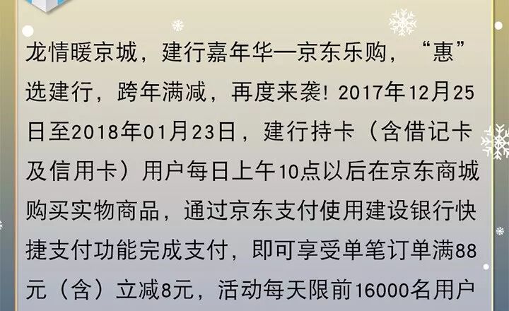 6.本活动项下京东支付平台服务、活动立减功能及相关售后服务等具体内容均由京东支付提供(24小时客服电话:95118),因本活动引发的包括京东商城平台服务在内的纠纷(支付结算服务除外)均由京东支付负责处理、解决,建设银行不承担相关责任。建设银行仅提供建行卡支付服务,与京东支付之间无代理、经销、担保等关系。