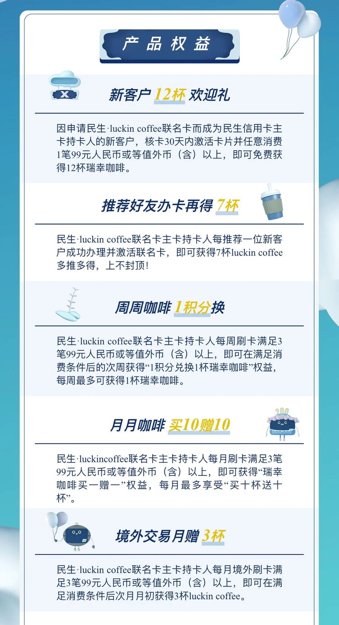 2021年4月30日(含)前,民生·luckin coffee联名卡主卡持卡人每月消费满足3笔99元(含)以上的交易,即可在满足消费条件后的次月获得“luckin coffee饮品买一赠一”权益,每月最多享受“买十杯送十杯”。