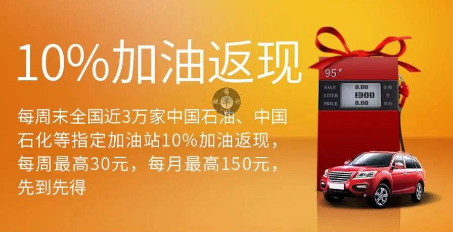 每周六、周日,在中石油/中石化加油站可享10%返现优惠,周限1次,每周限返30元、每月限返150元