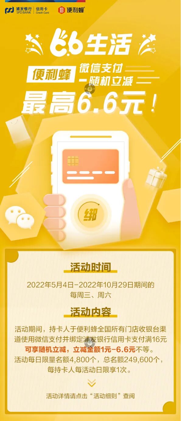 1、活动期间,持卡人于便利蜂全国所有门店收银台渠道使用微信支付并绑定浦发银行信用卡支付满16元可享随机立减,立减金额1元-6.6元不等。活动每日限量名额4,800个,总名额249,600个,每持卡人每活动日限享1次。名额有限,先到先得,额满即止。(付款前请核对是否已将付款卡片切换为浦发信用卡)。