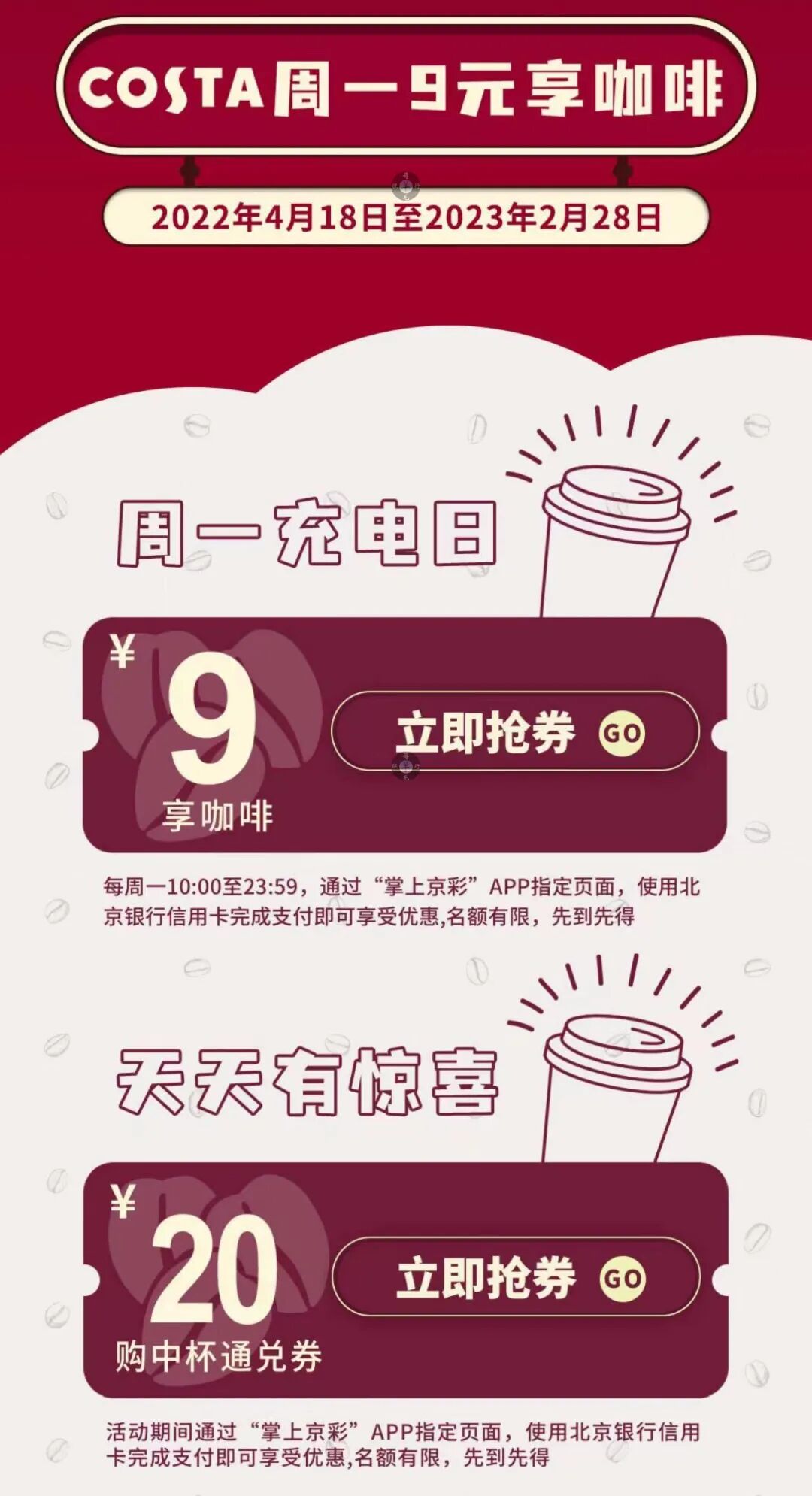 5、每周一10点,5折抢购:100元北京呷哺呷哺、50元北京味千拉面、9元购29元瑞幸咖啡券、9元购COSTA咖啡中杯券,周各限1次、月各限2次