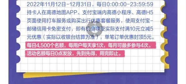 2、11.12-12.31每日0点,高德打车,支付宝消费,满10减5元,日限1次、月限4次,4500名额