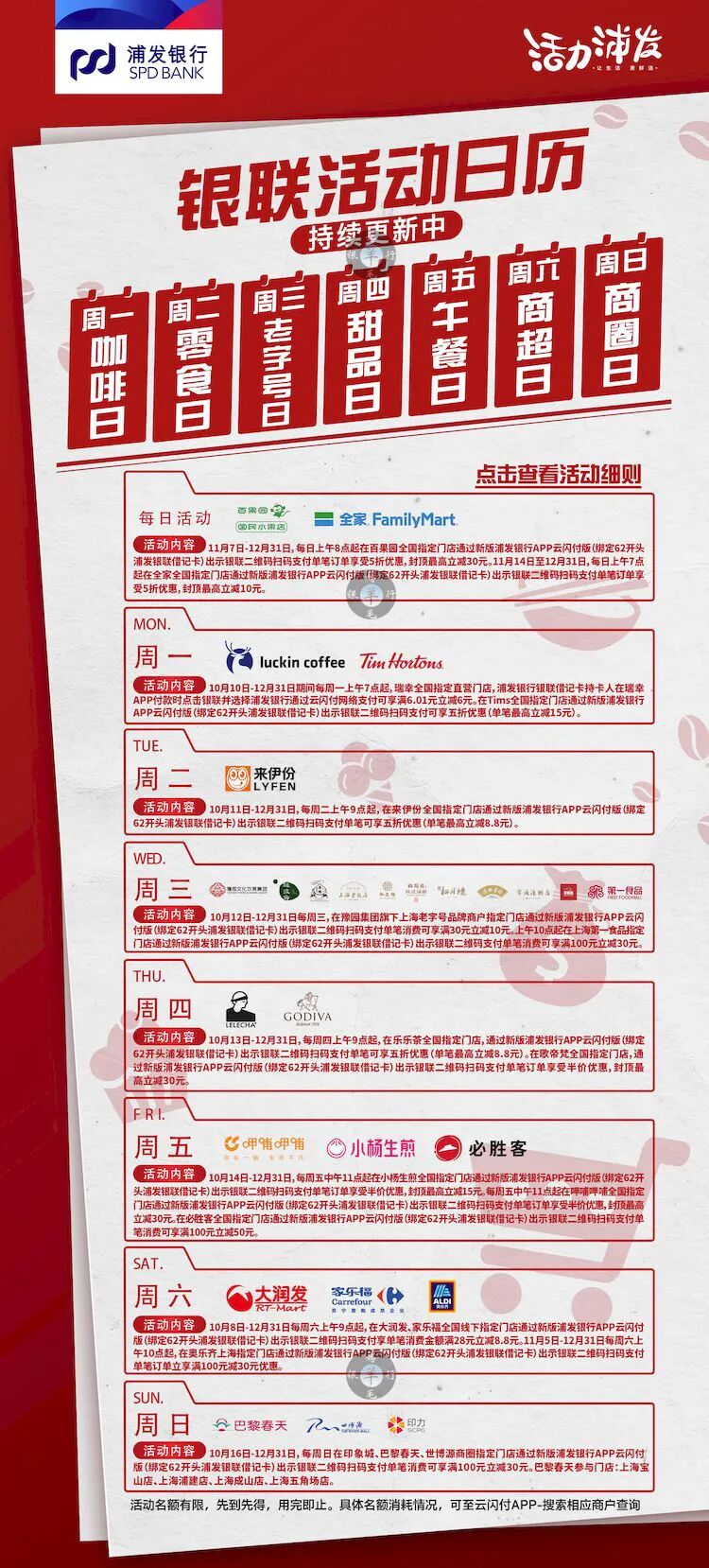 2022年11月14日至2022年12月31日期间,每日上午7点起在全家全国指定门店通过新版浦发银行APP云闪付版(绑定62开头浦发银联借记卡)出示银联二维码扫码支付单笔订单享受5折优惠,封顶最高立减10元。每活动日限优惠名额为3125名,每人每活动日限享1次优惠机会,每周限享2次优惠机会。名额有限,先到先得,用完即止。