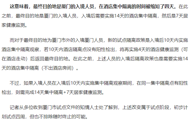 根据以上的内容来看,8个试点城市从4 月 11 日开始试点执行 10 天集中隔离 + 7 天居家健康监测,这比以前少了4天。