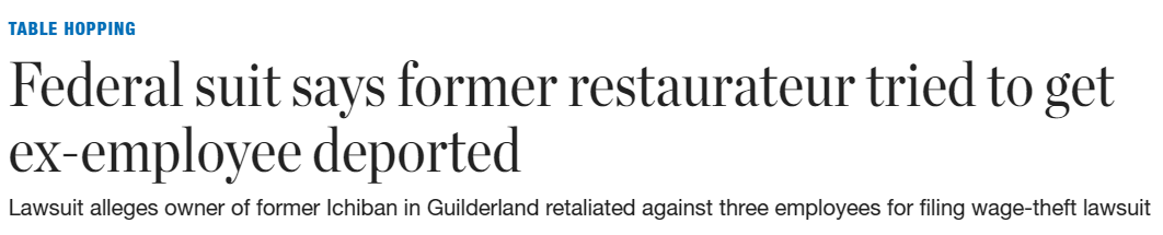 诉讼称,位于纽约上州某餐厅的老板叶大卫向移民官员举报其三名前员工是非法移民,导致一名员工被捕。