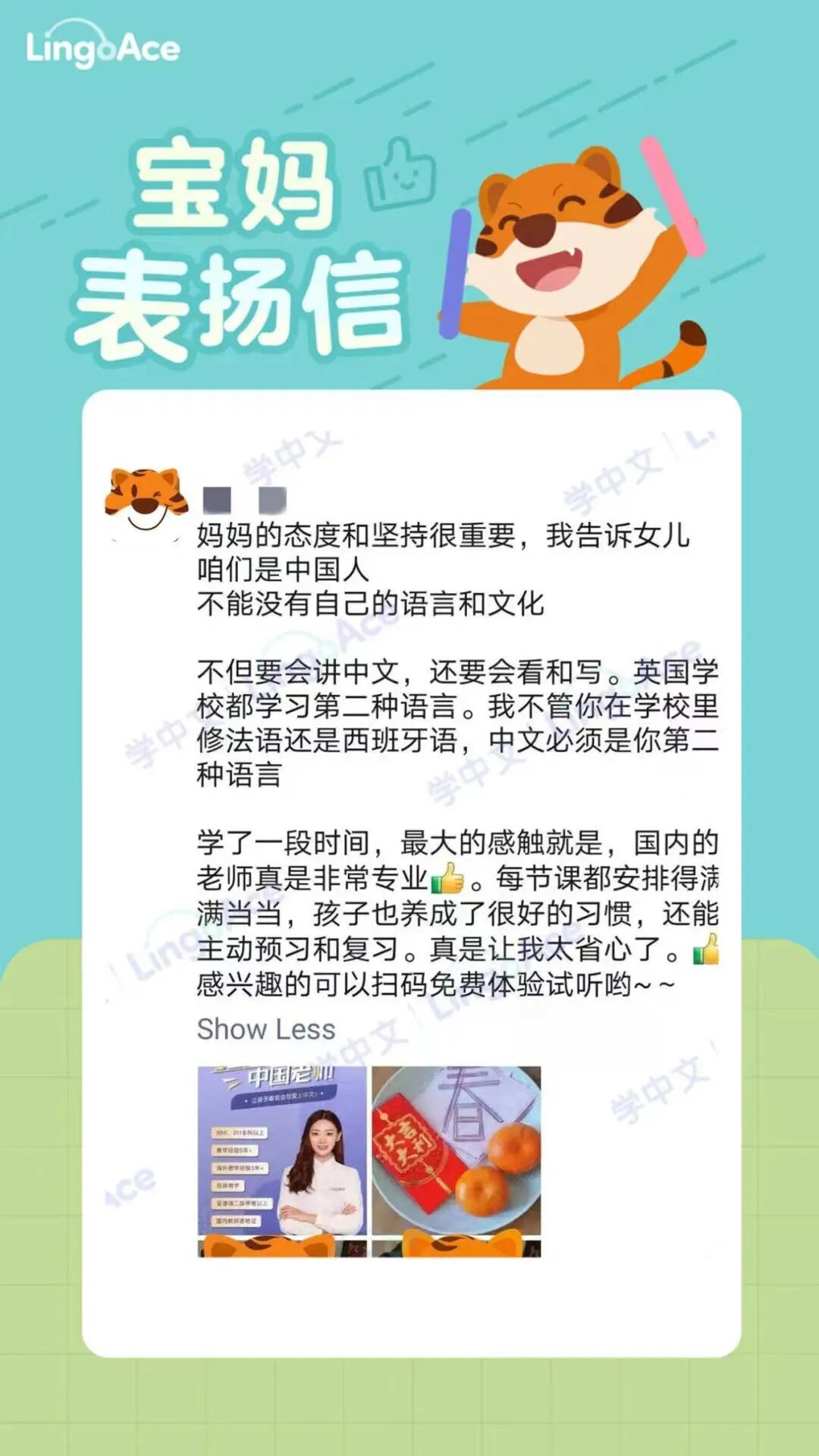 最初的10节课,Vivian一直怀着惴惴不安的心情“监督”,生怕女儿学不到东西。而后她发现,LingoAce的老师不仅仅是在教学上专业,也会关心孩子的心情,鼓励孩子开口交流,并把中华文化中最温情、富有诗意和力量的精神内核,在潜移默化中传递给了孩子。