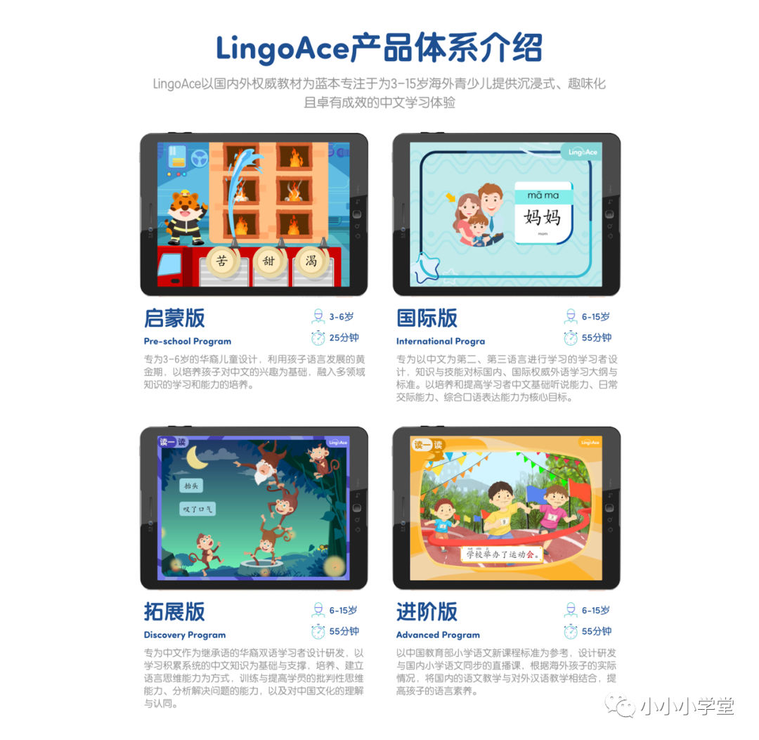 LingoAce在国际在线语言教育领域深耕多年,已拥有中文直播课、英文直播课、Ace Chinese Books、中文素养课等多款优质产品,深受海外家长赞誉!