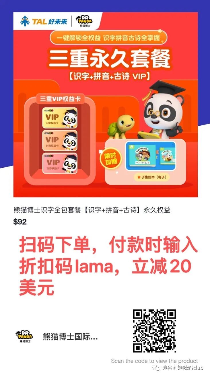 购买识字+拼音+古诗三重套餐原价$95美金,本次团购价,付款时输入折扣码lama,立减$20美金,到手价只需$75美金,即可把“一次性付费,永久有效的”识字APP带回家.另外赠送:熊猫博士一级识字卡230张、成语接龙铁盒卡片、识字大富翁、练字帖5册。![]()