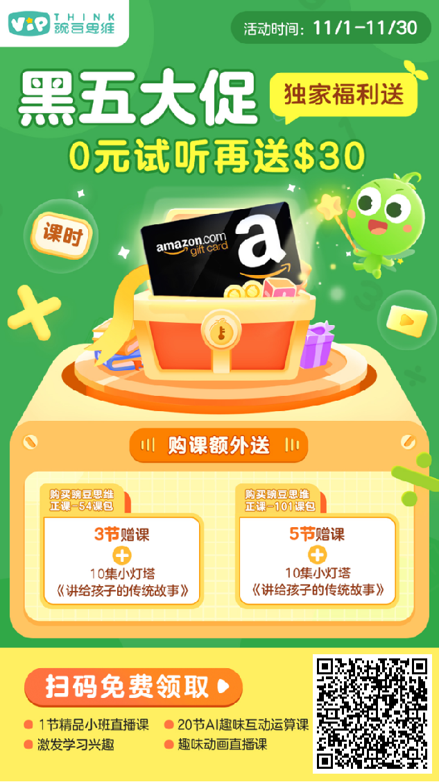 1)0元领:免费领取31节课,1节小班益智直播课+21节探索视频课,10节美术课,试听就送30美金亚马逊礼品卡!