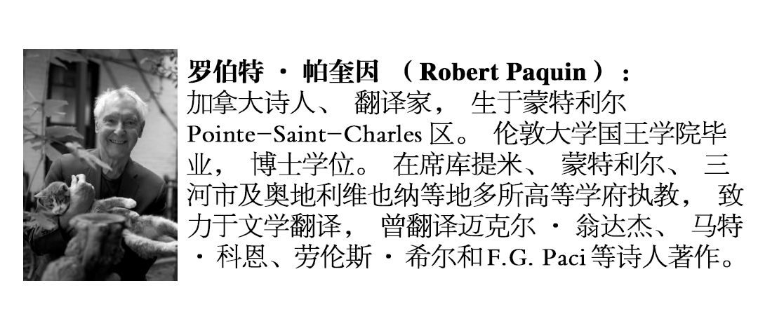 Robert Paquin is a Montreal poet and translator from the Pointe-Saint-Charles area. After earning a Ph.D. at King’s College, University of London, he taught at several universities in Chicoutimi, Montreal, Trois-Rivières, and Vienna (Austria), while devoting himself to literary translation (novels by such renowned Canadian authors as Michael Ondaatje, Matt Cohen, Lawrence Hill and F.G. Paci).