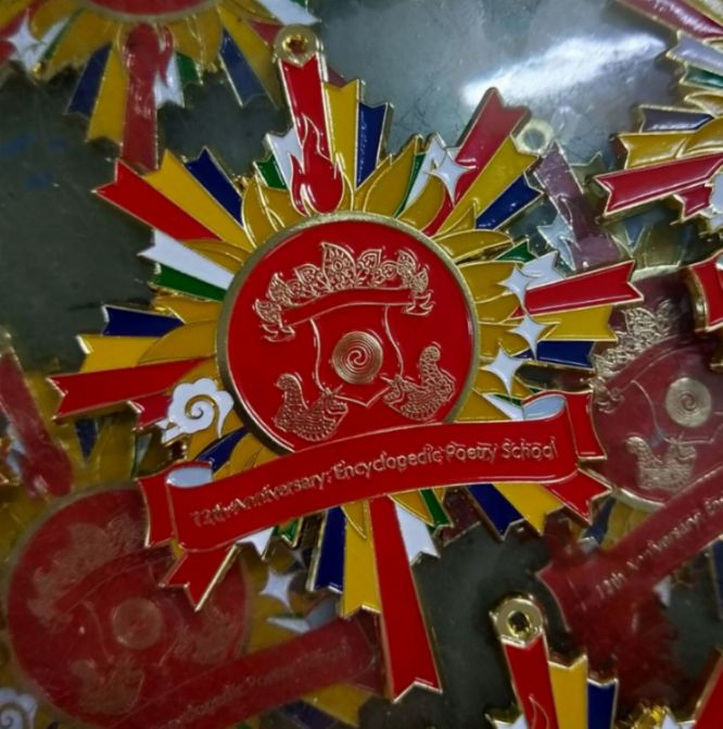 为回馈与我们建立合作关系和支持、襄助我们的国内外友人,我们隆重推出“百科诗派创派12周年纪念徽章”(限量版48枚),纯原创设计,由百科诗派创始人殷晓媛创意设计并亲笔绘制线稿及起草设色方案,由曾与中铁、中国电信、华为、腾讯、万科等大客户合作的资深艺术设计集团最终定稿制作。徽章为上下章结构,主体直径7cm,正面镀金,五色复合色烤漆,背面磨砂工艺,中英文凸字铭文,上部为精美布艺饰带,高端定制精密开槽丝绒礼盒包装。