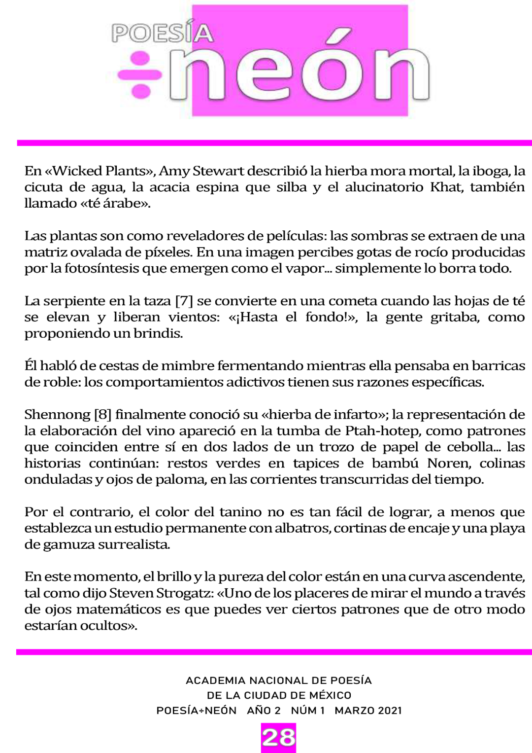 POESÍA ENTRE NEON. AÑO 1 NÚM. 67 MAR/ABR 2021. Suplemento de la revista “En sentido figurado”. Órgano Oficial de la Academia Nacional de Poesía de la Ciudad de México. Academia Nacional de Poesía de la Ilustre y Benemérita Sociedad Mexicana de Geografía y Estadística. ISSN: 2007-0071. Revista literaria de publicación bimestral vía red de cómputo. Queda estrictamente prohibida la reproducción total o parcial de los contenidos e imágenes de la publicación sin previa autorización de POESÍA ENTRE NEÓN. Las opiniones expresadas por los autores no necesariamente reflejan la postura de los editores. El contenido de los textos es responsabilidad del autor, POESÍA ENTRE NEÓN los incluye en apoyo a la libertad de expresión y el respeto a la pluralidad. Publicación sin fines de lucro que no admite patrocinios y es sufragada con recursos propios. PROHÍBIDA SU VENTA. Esta revista se terminó de editar el 28 de marzo de 2021.