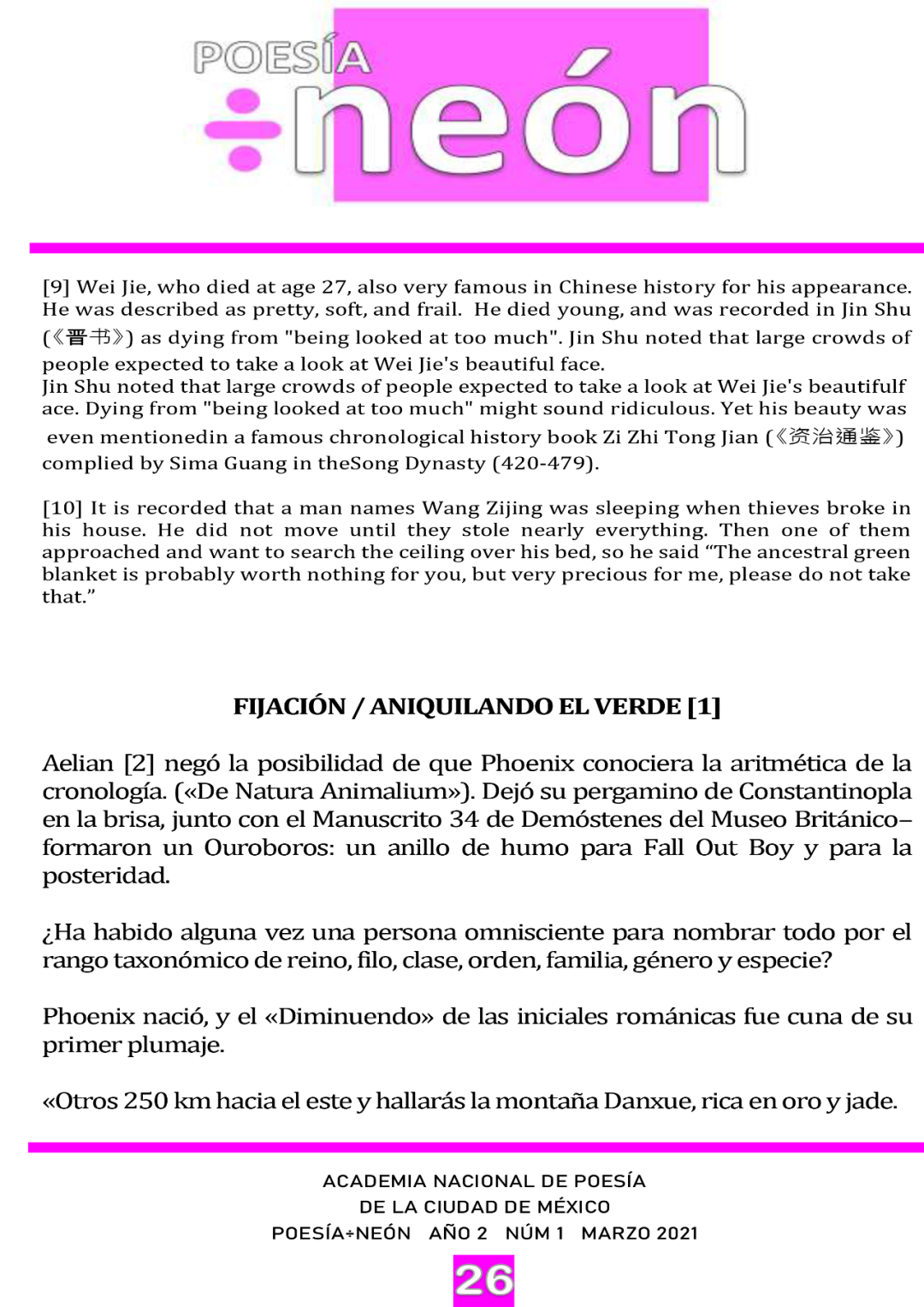 近日,墨西哥国家诗歌学会(Academia Nacional de Poesía CDMX)官方双月刊《Poesía÷Neón》( ISSN:2007-0071)总第67期、2021年3、4月号以九个整版刊发百科诗派创始人殷晓媛的中国茶文化主题诗歌《杀青》,本诗位于刊内21-29页,英文、西班牙双语,英文由作者自译,西班牙语版由马德里诗人、翻译家Beatriz Russo翻译。