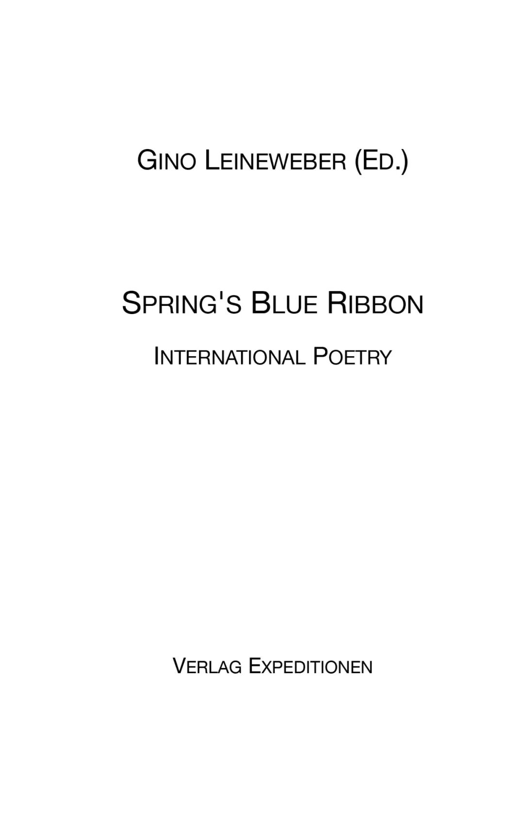 2021年10月,德国汉堡已有十年历史的Verlag Expeditionen出版社隆重出版大型国际诗选《Spring's Blue Ribbon》(《春天的蓝丝带》)。主编为汉堡作家协会(Hamburger Autorenvereinigung)名誉主席、第十四届“波塞多尼亚•帕埃斯图姆国际诗歌奖”得主Gino Leineweber,收录来自德国、英国、西班牙、意大利、希腊、美国、阿根廷、波斯尼亚、土耳其、荷兰、印度、沙特阿拉伯等世界各国诗人以“春季”为主题的作品60件,其中收入中国诗人殷晓媛《春季发布:泽费罗斯vs.芙洛拉》。选集中所有诗歌均为诗人母语与英语双语对照形式。
